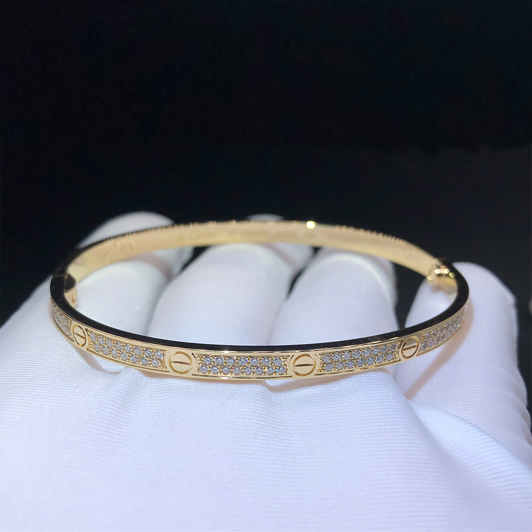 Crafted in luminous 18K yellow gold, the Cartier Love Bracelet Small Model is a timeless emblem of elegance and devotion. Its iconic screw motifs are delicately set between rows of dazzling pavé diamonds, radiating brilliance with every movement. Sophisticated and refined, this exquisite piece perfectly balances modern luxury with enduring romance.
