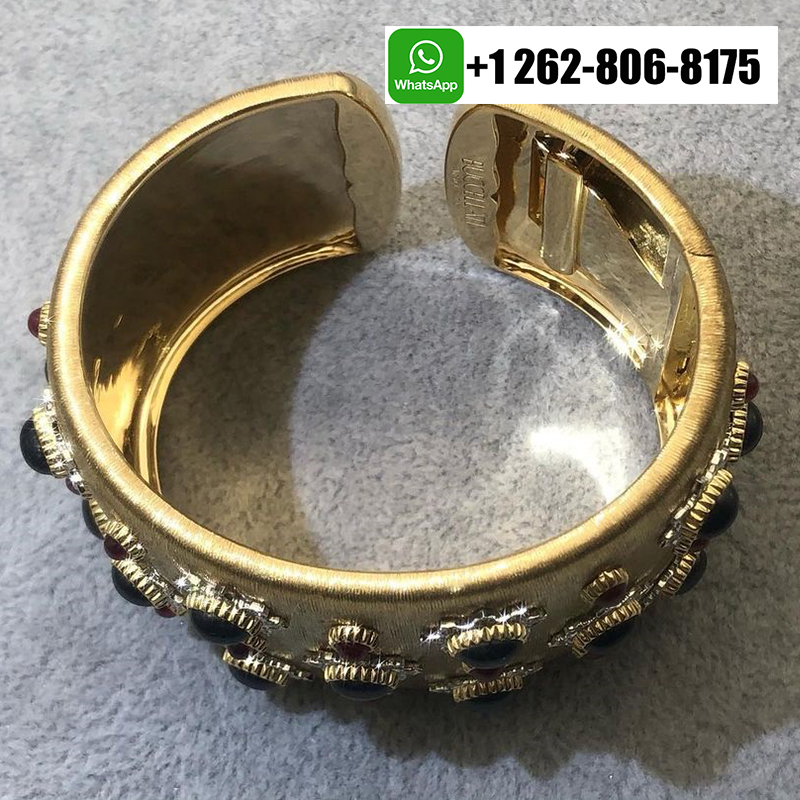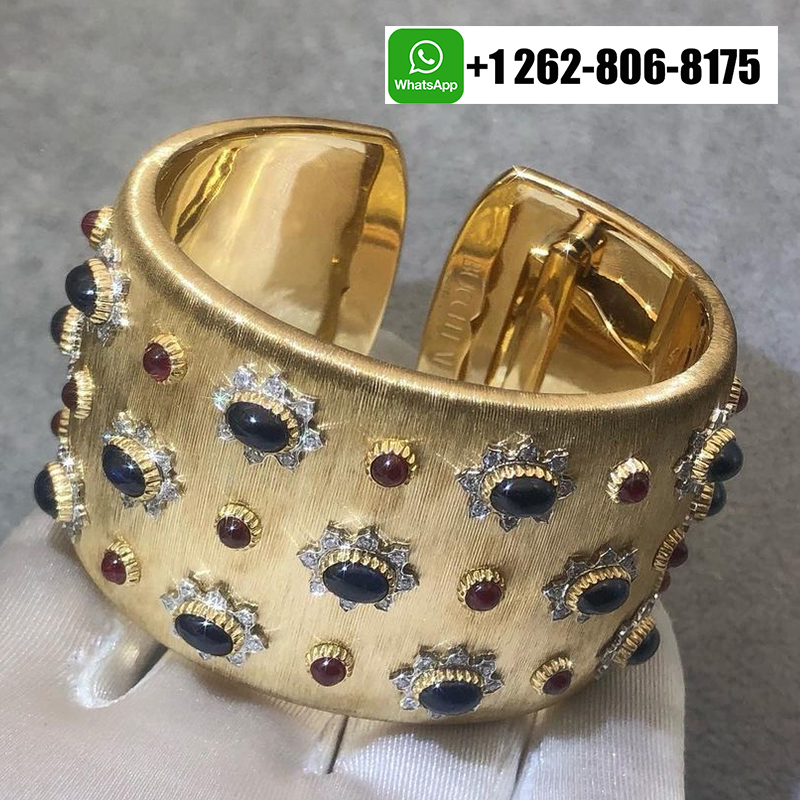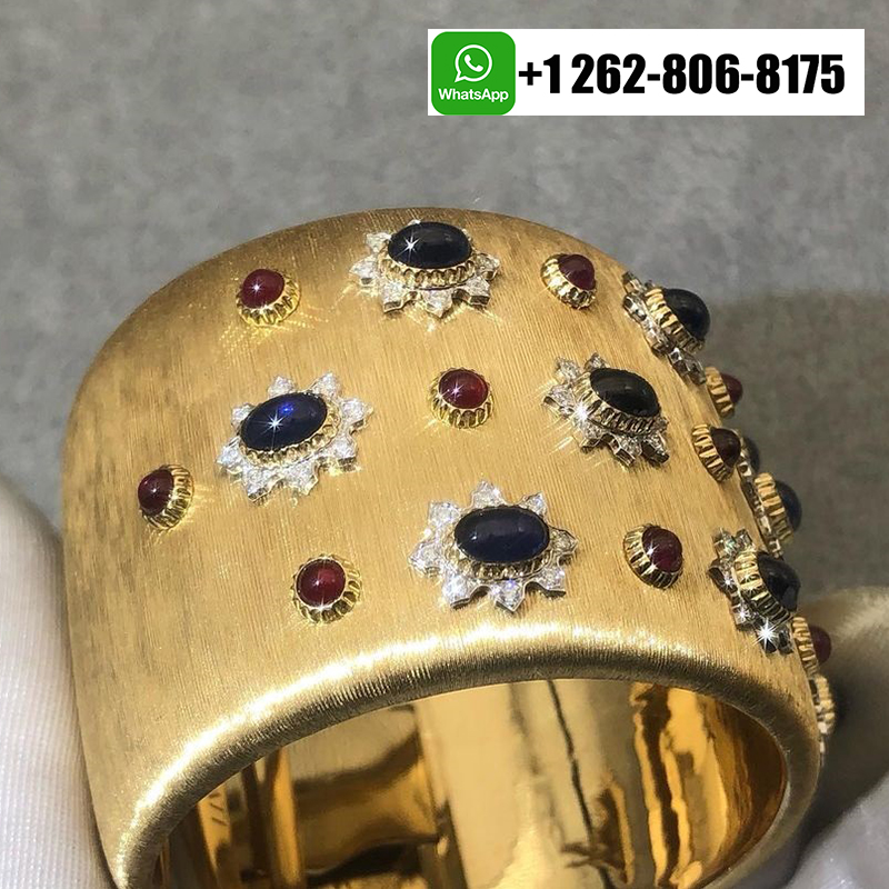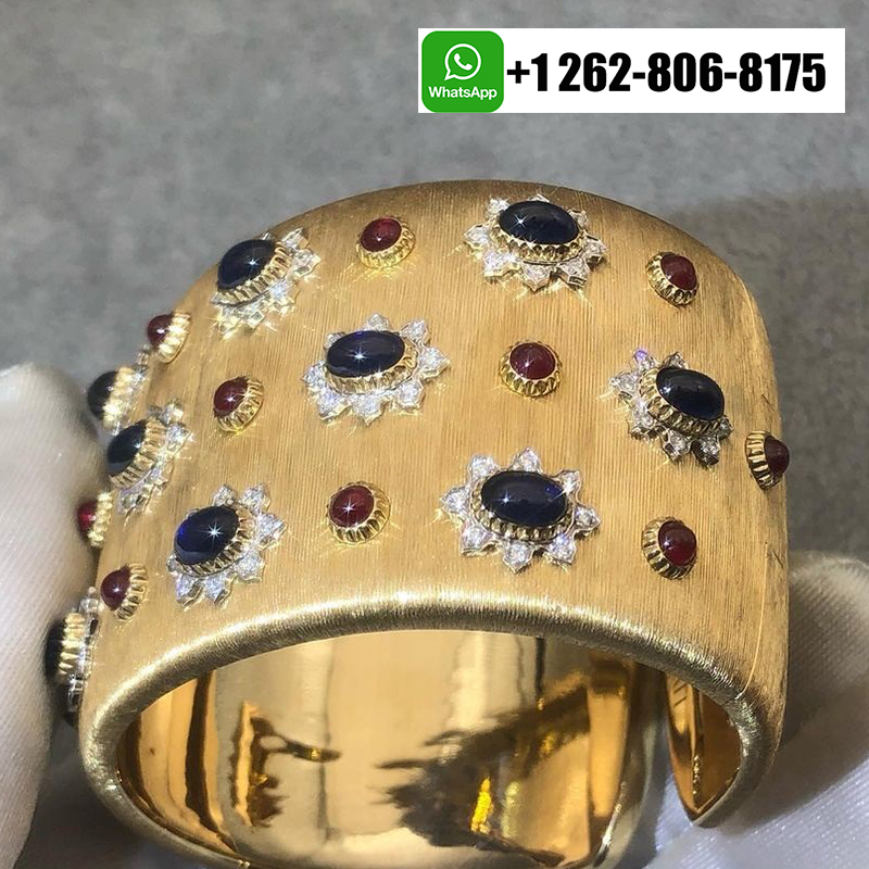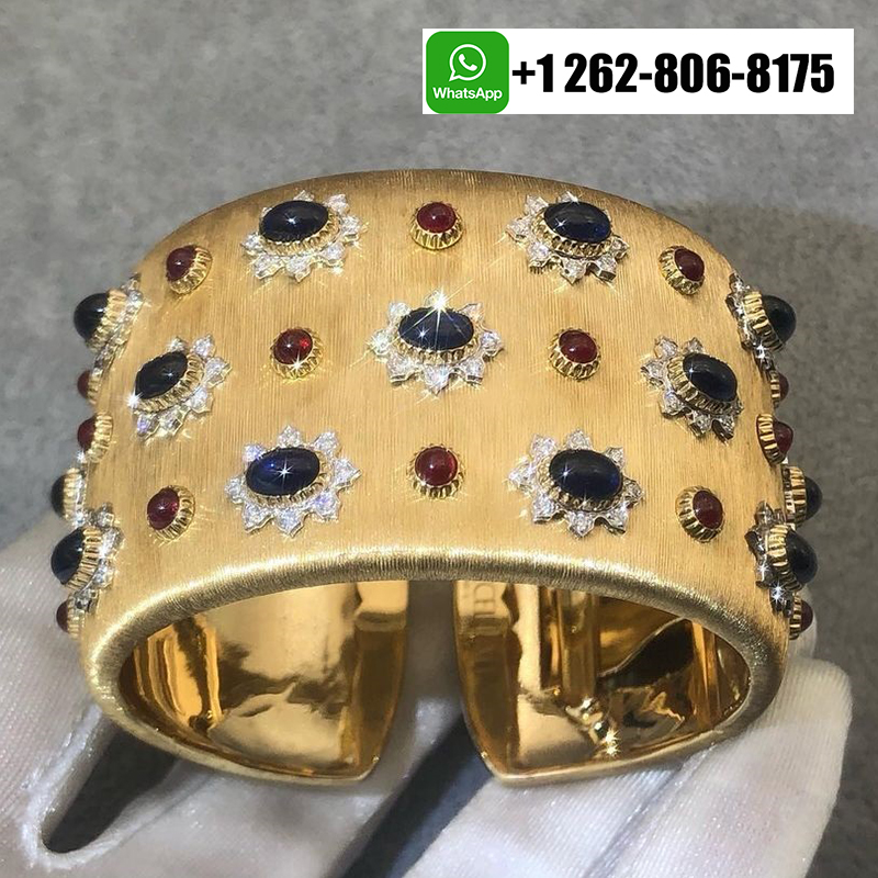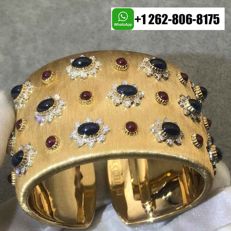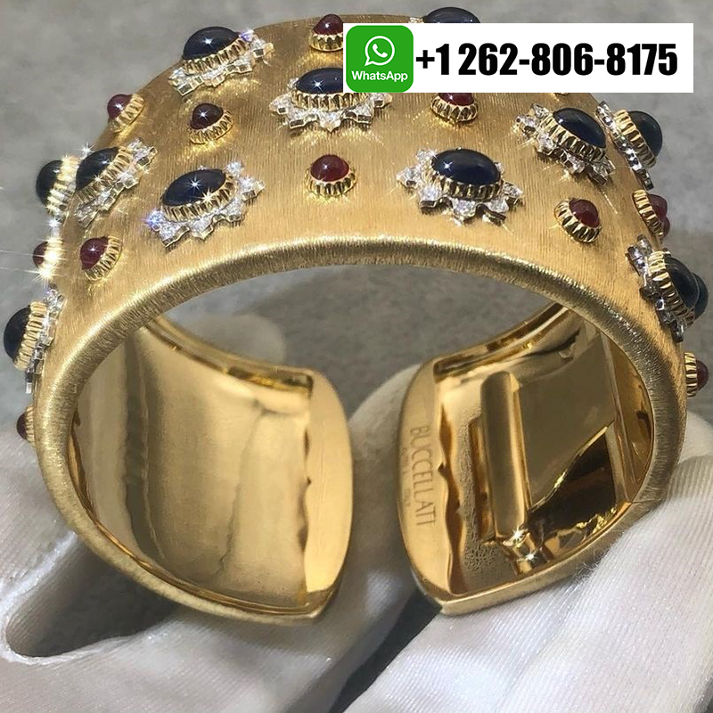 Home / Buccellati Jewelry / Buccellati Diamonds, Sapphire, Ruby 18k Yellow Gold Wide Cuff Bracelet