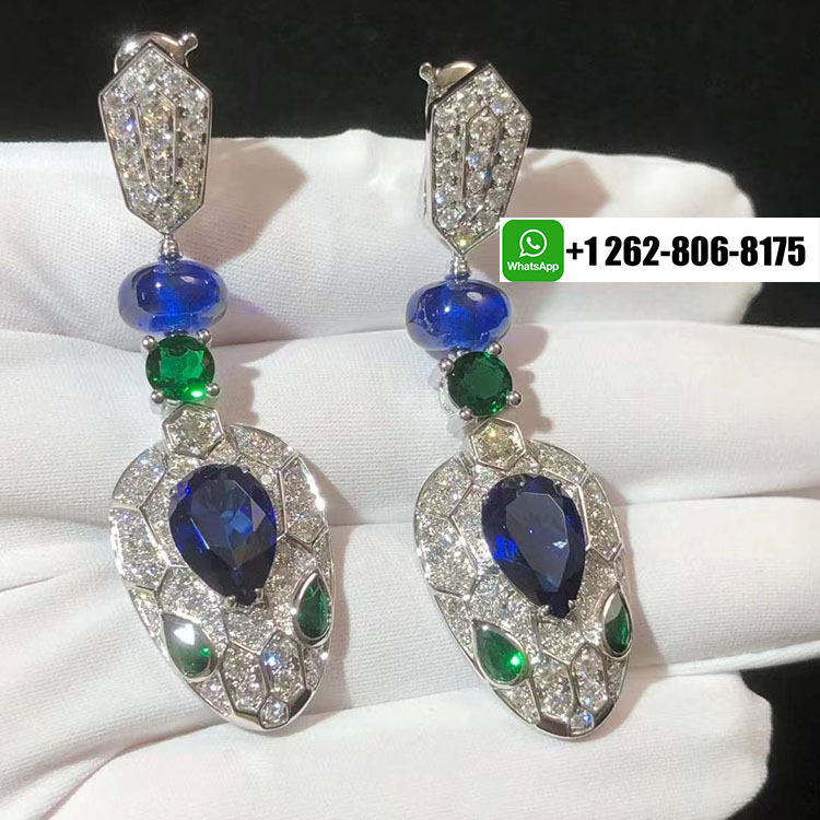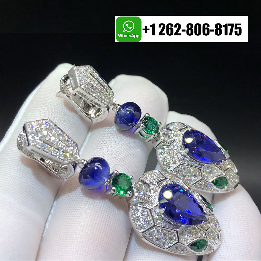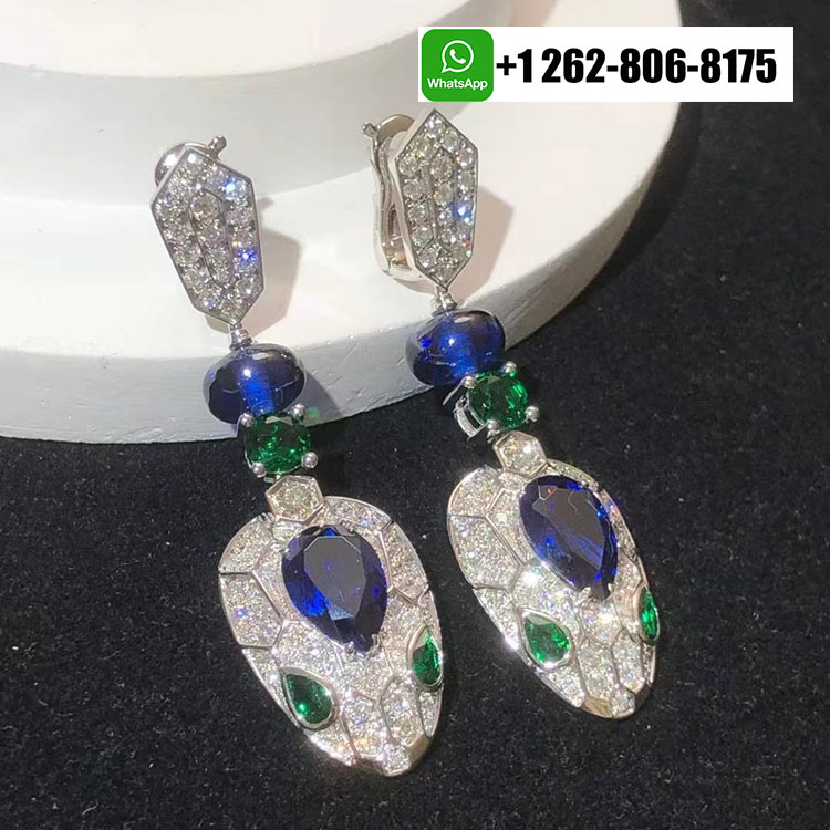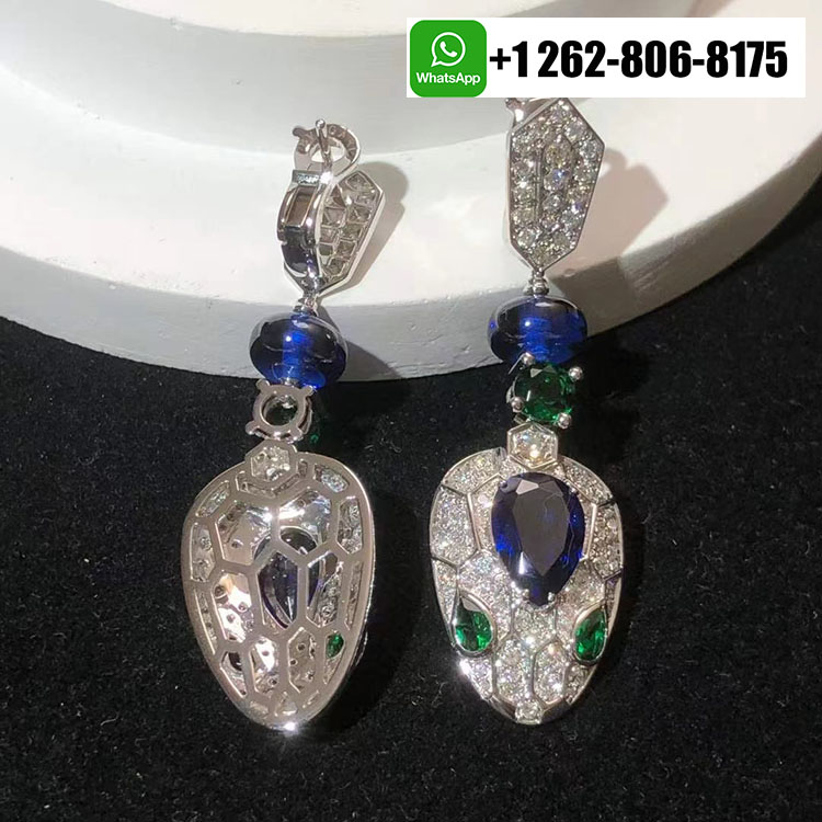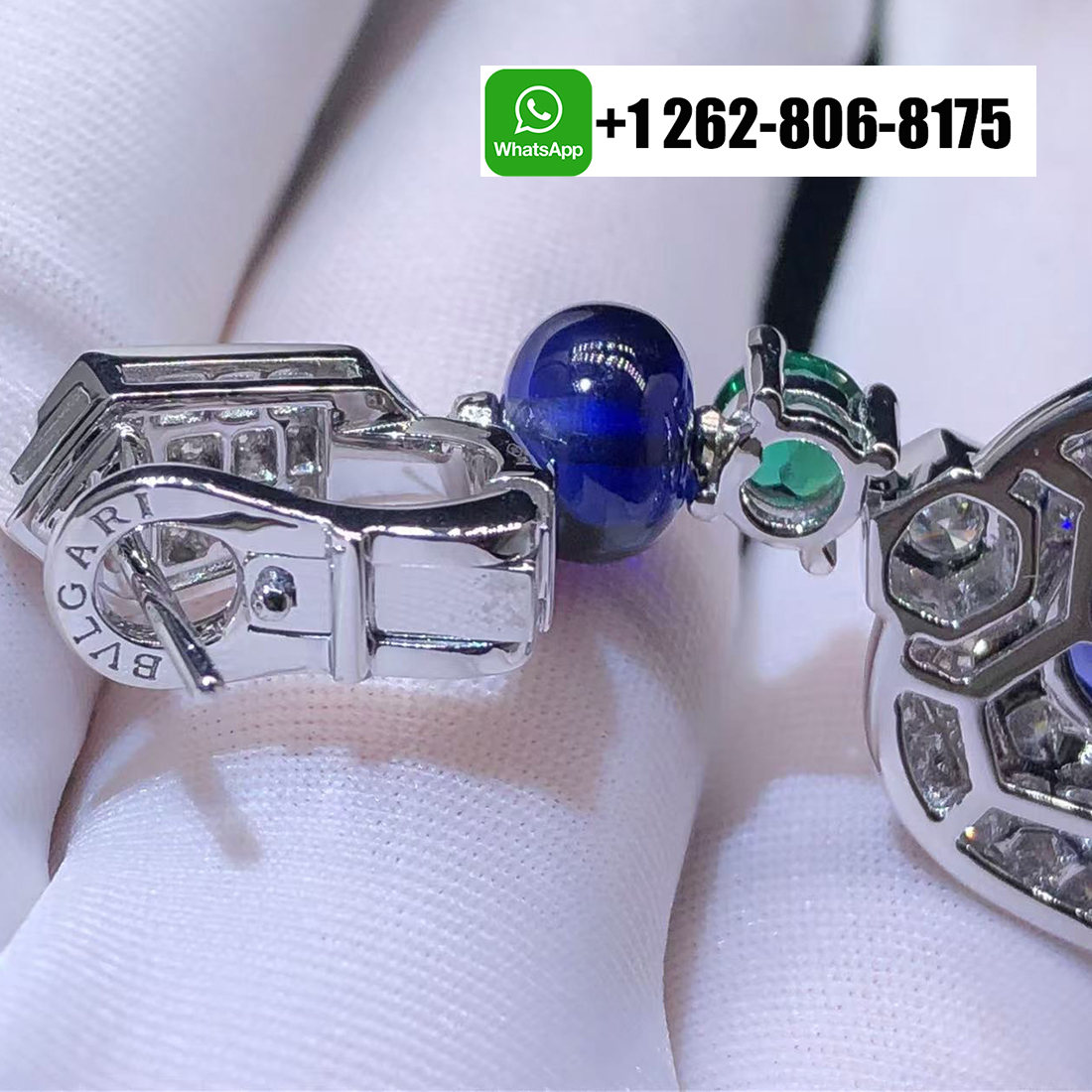Bvlgari 18k White Gold Pave Diamond Serpenti Earrings with Blue Sapphire and Emearlds