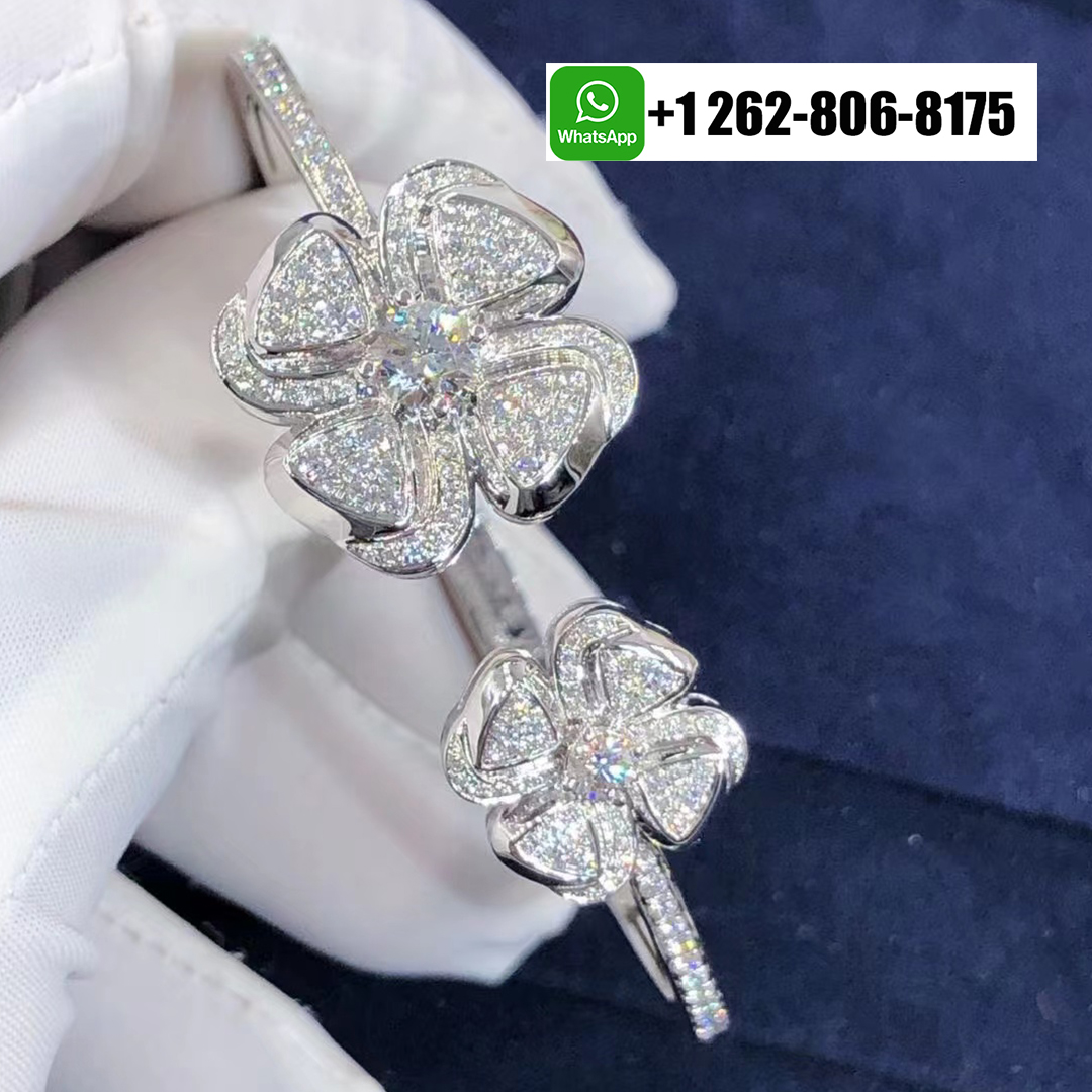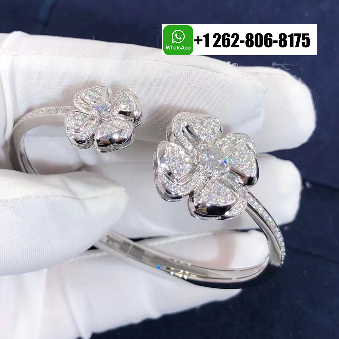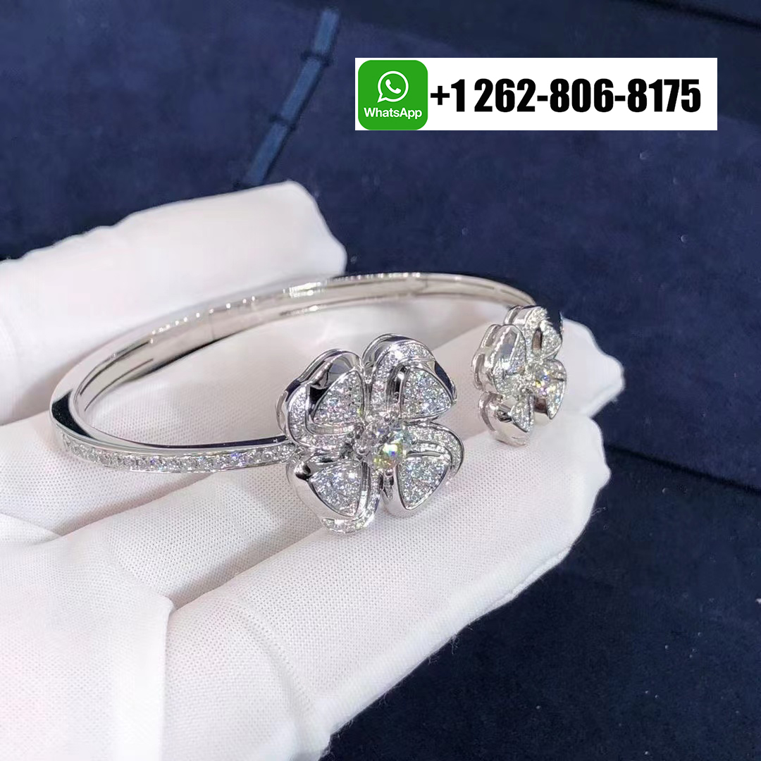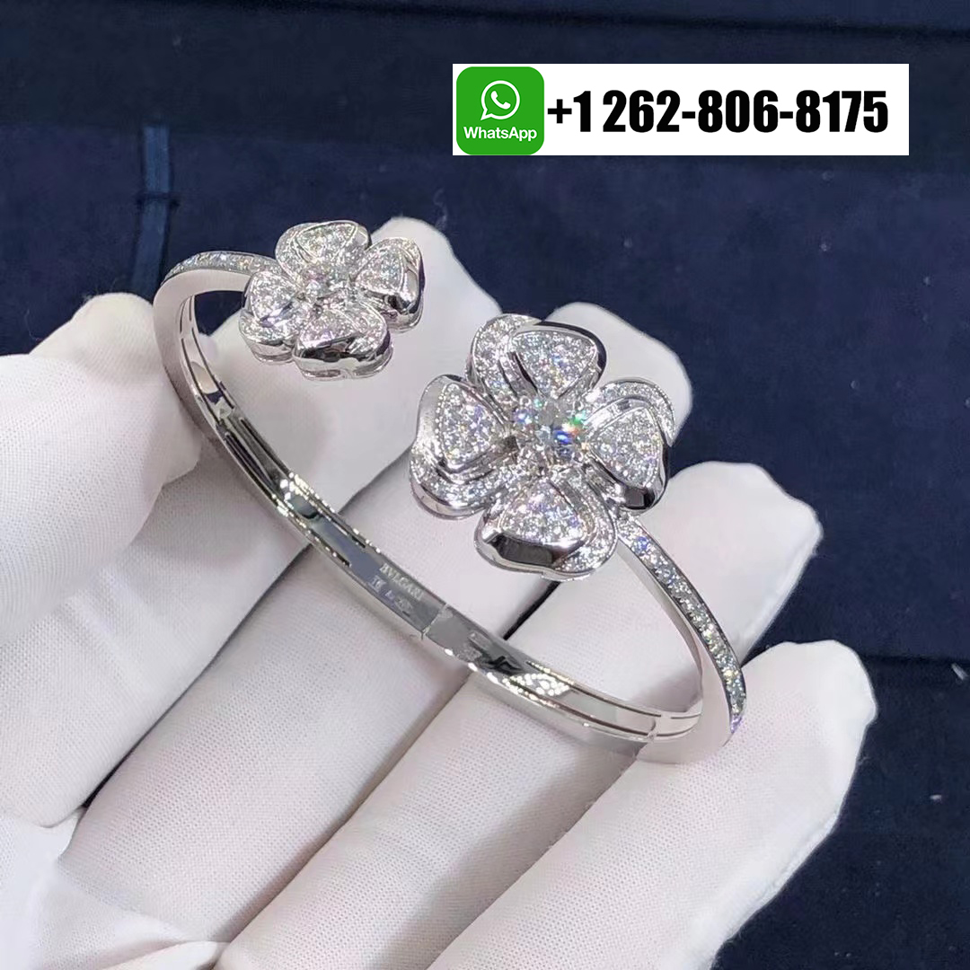 Inspired by the eternal beauty of the Roman flower, this Bvlgari Fiorever 18K White Gold Diamond Bracelet and illuminated with brilliant-cut pavé diamonds. The open bangle design showcases two iconic four-petal floral motifs—symbols of joy and light—each radiating with exquisite sparkle. Graceful and feminine, this dazzling creation captures Bvlgari’s signature harmony of timeless elegance and contemporary Roman glamour.