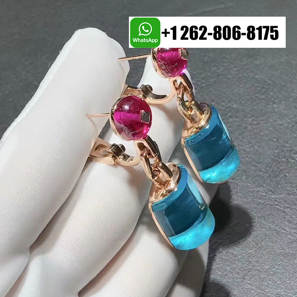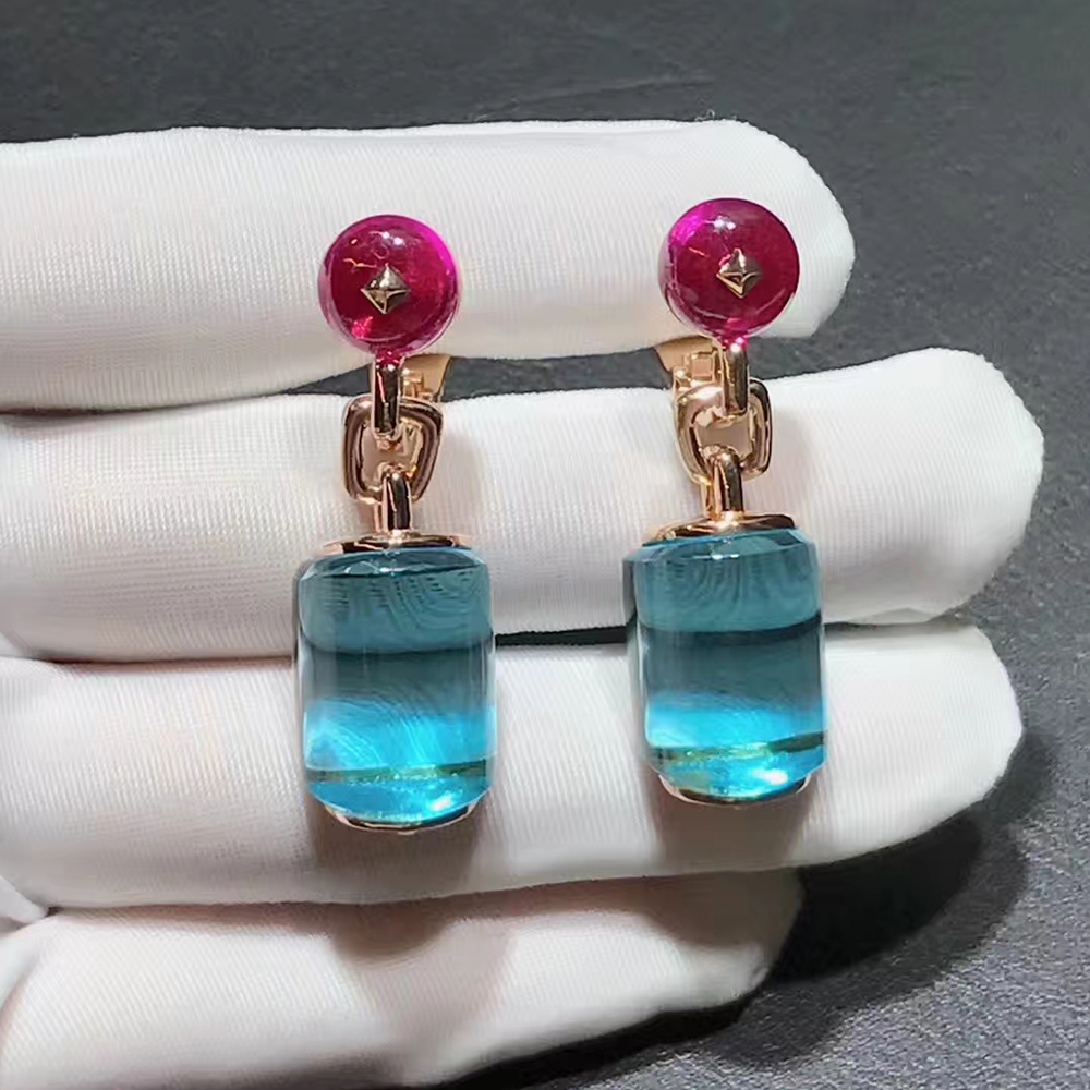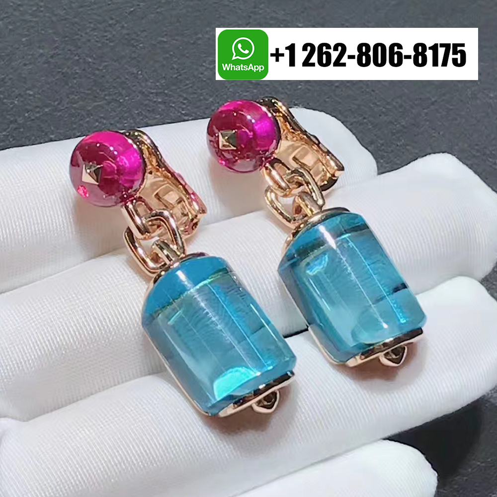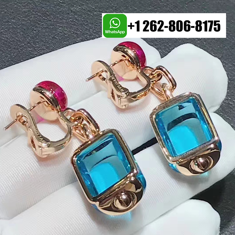 Bvlgari Ladies MVSA 18k Rose Gold Earrings With Blue Topaz and Rubellite Beads