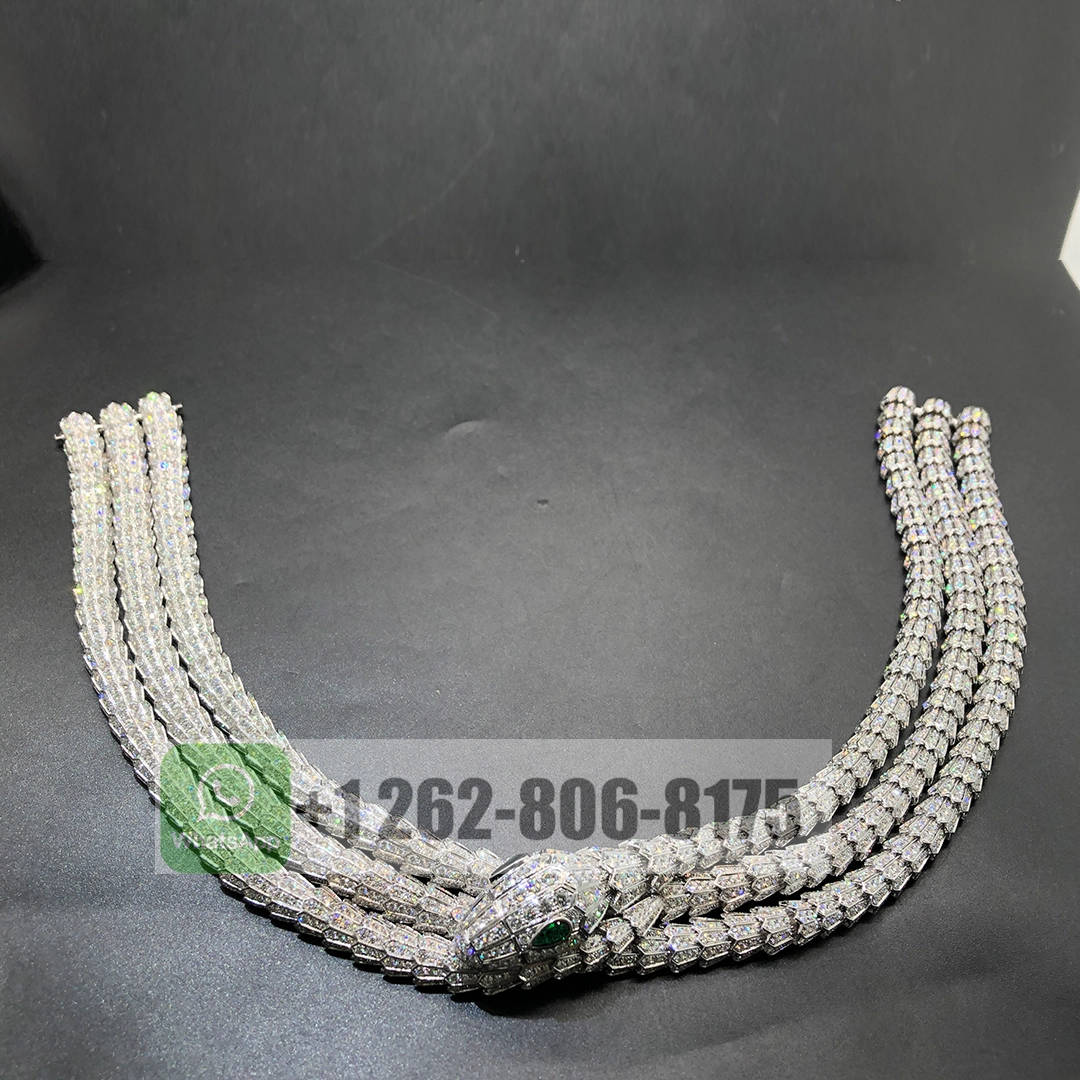 Bvlgari Serpenti High Jewelry Full Pave Diamonds Three Circles 18k White Gold Necklace with Emeralds