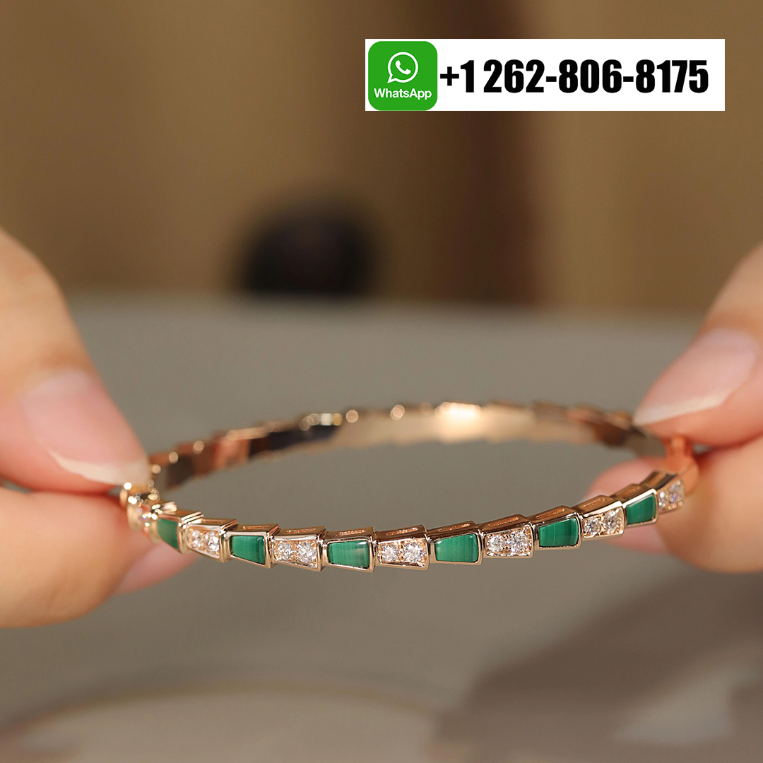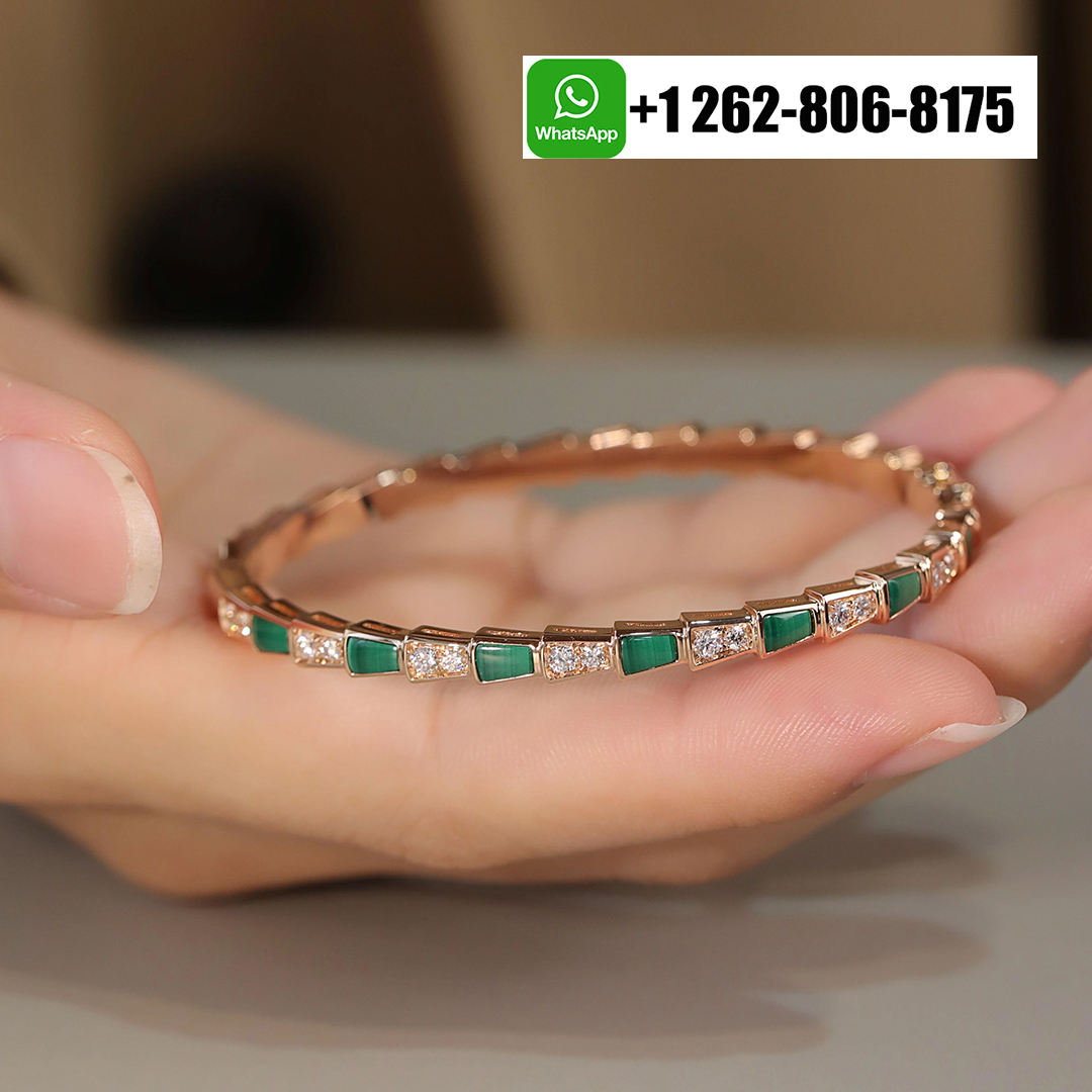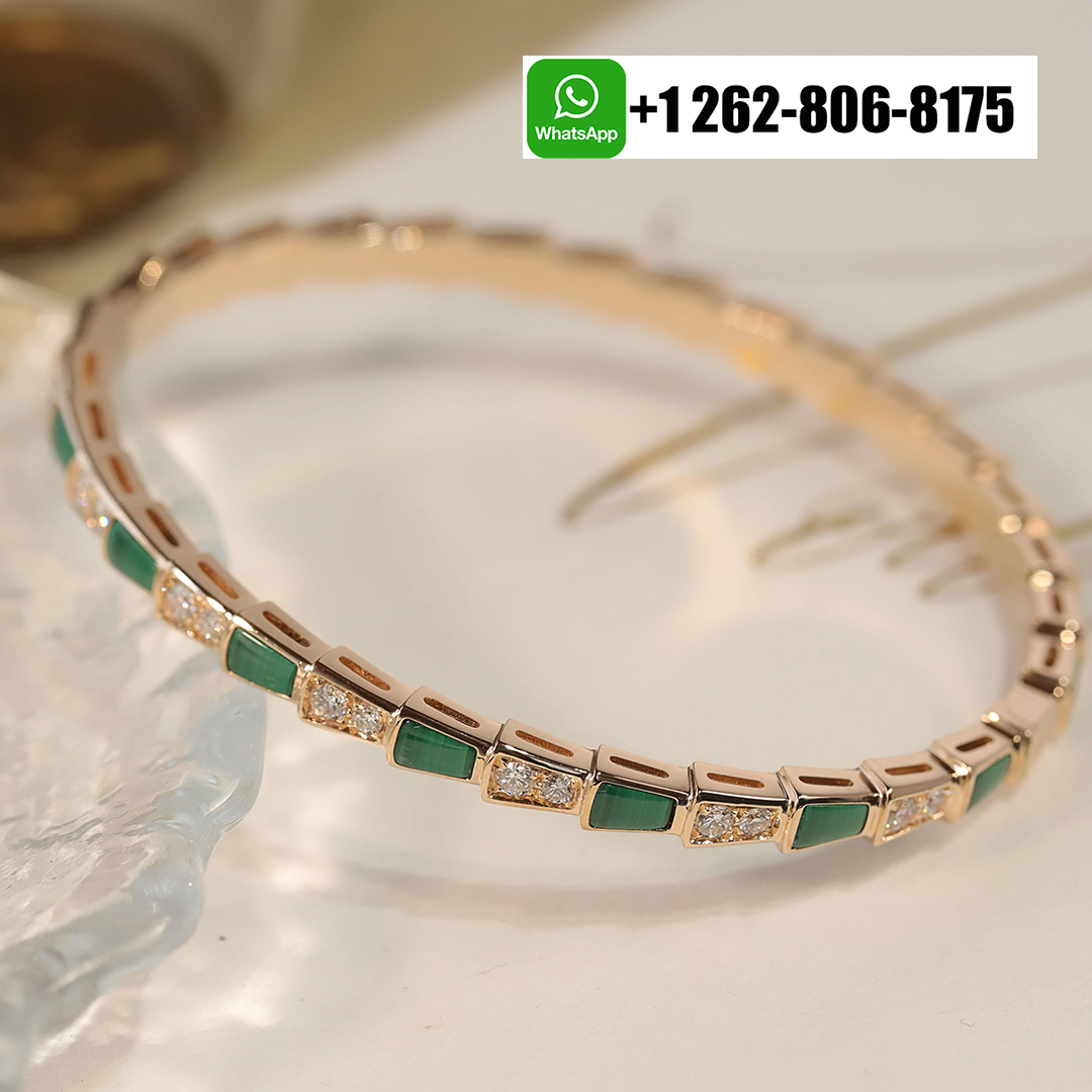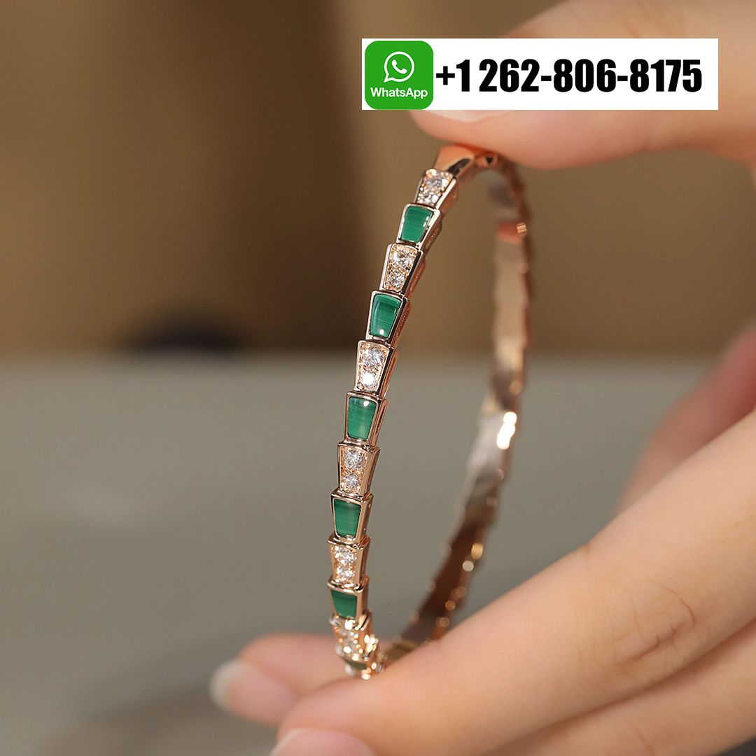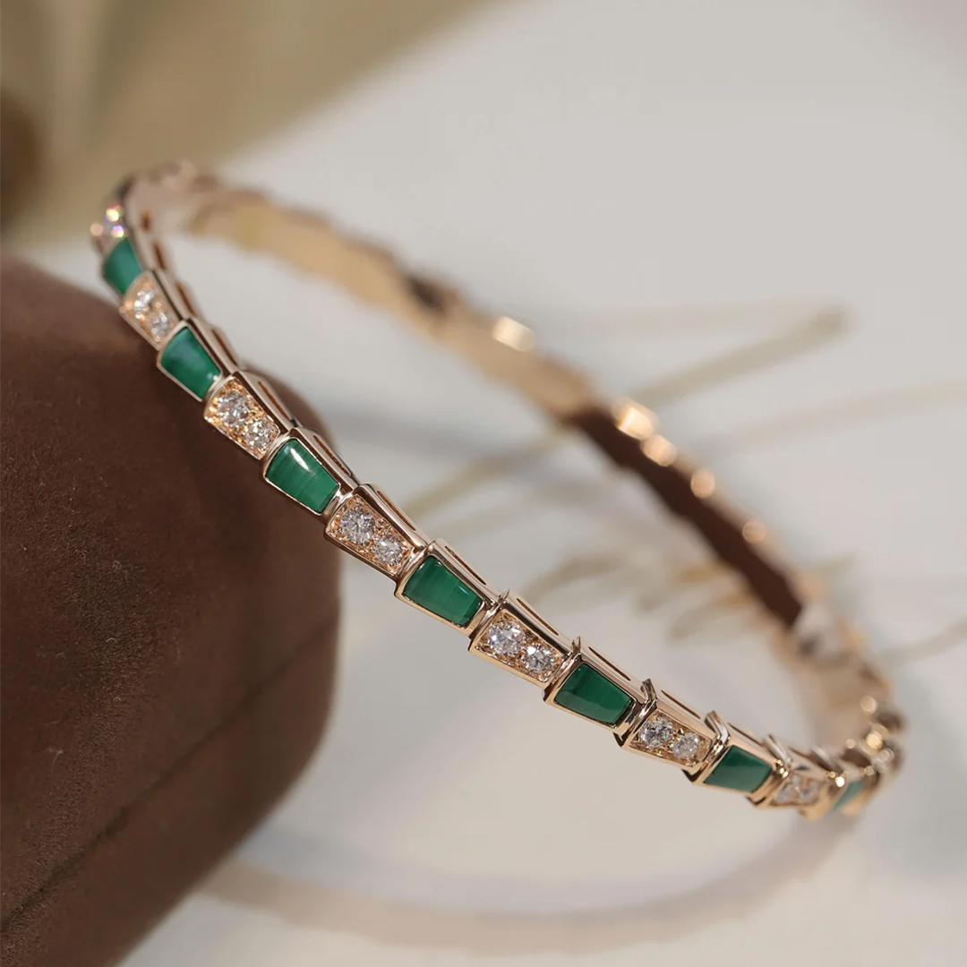 Evocative of the viper’s spiral movement before its strike, the Bvlgari Serpenti Viper 18k Rose Gold Thin Bangle Bracelet with Diamond and Malachite coils sensually around the wrist combining the dangerous beauty of the precious scales with the sinuosity of the snake. In a mesmerizing play between light and shadow, knowledge and desire, temptation and desire, the two irresistible facets of the serpent’s nature are revealed through a captivating design.