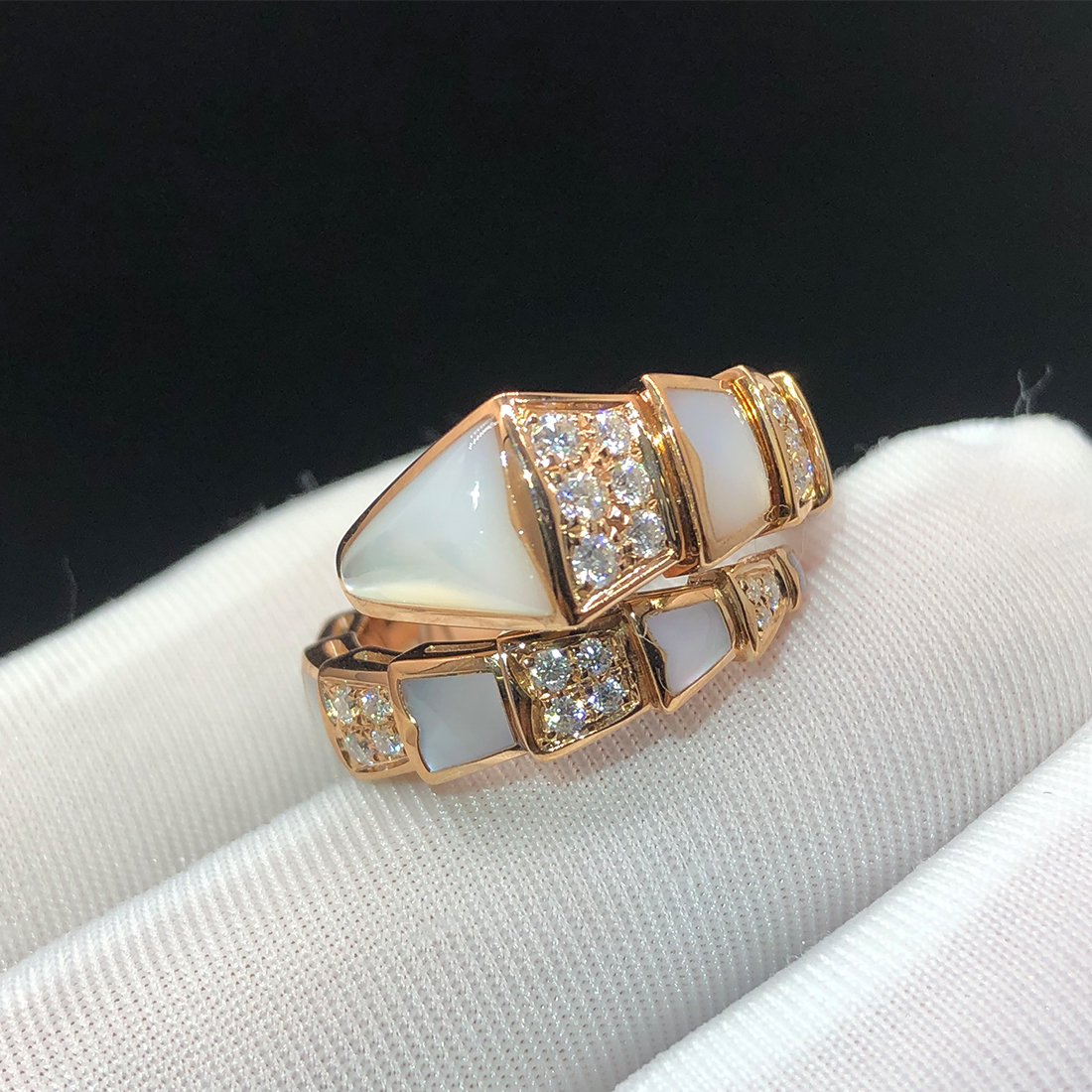 Bvlgari Serpenti Viper One-coil 18k Rose Gold Ring with Pave Diamonds and White Mother-of-pearl 350667