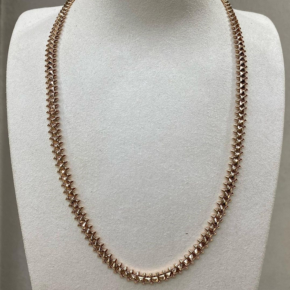 This Clash de Cartier small model flexible long necklace embodies a perfect balance of boldness and refinement. Crafted in 18k rose gold, the design features the collection’s signature studded motif, offering both structure and fluidity. Measuring 6.5mm in width and 90cm in length, the flexible construction drapes elegantly around the neck, showcasing Cartier’s mastery of contrast — where edgy geometry meets timeless sophistication.