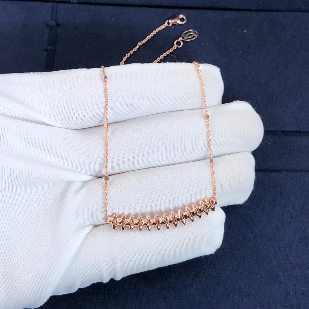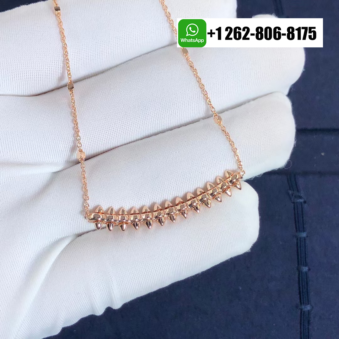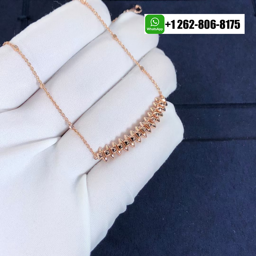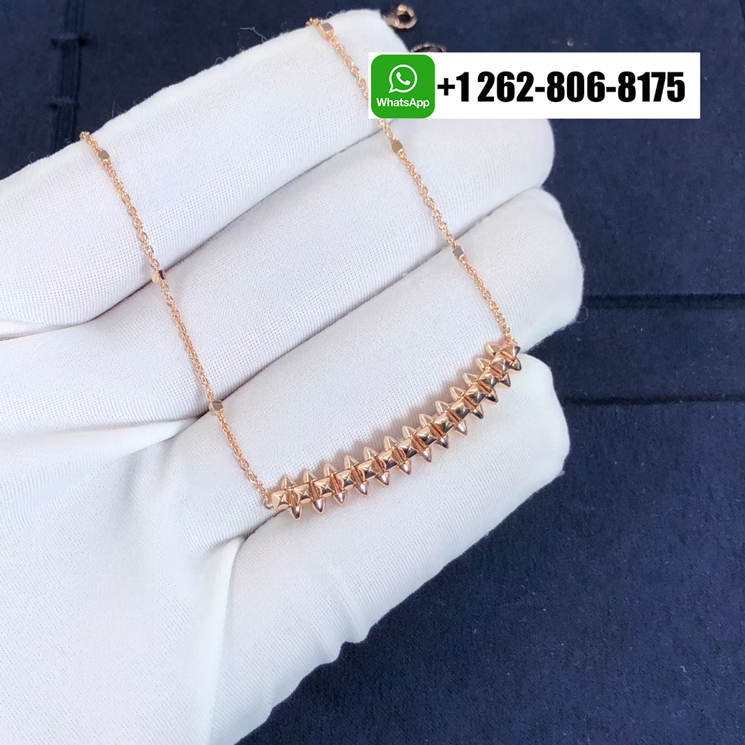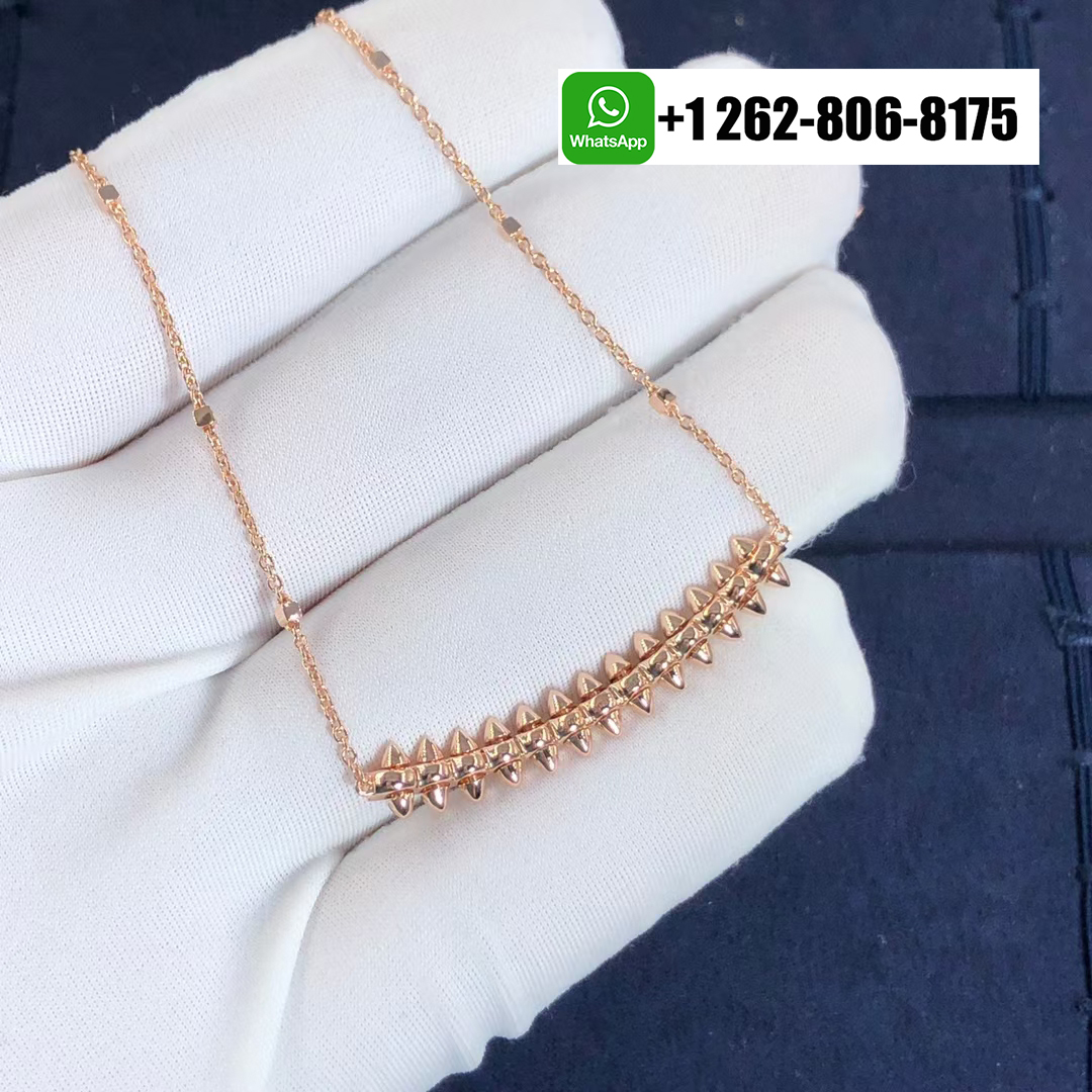 This Clash de Cartier pendant necklace medium model, captures the Maison’s dual spirit of elegance and edge. Crafted in 18k rose gold, the pendant measures 44mm in length and 8mm in width, featuring Cartier’s iconic studded design. Suspended from an adjustable chain measuring 38–41cm, it exudes contemporary sophistication with bold architectural lines and refined Parisian craftsmanship.