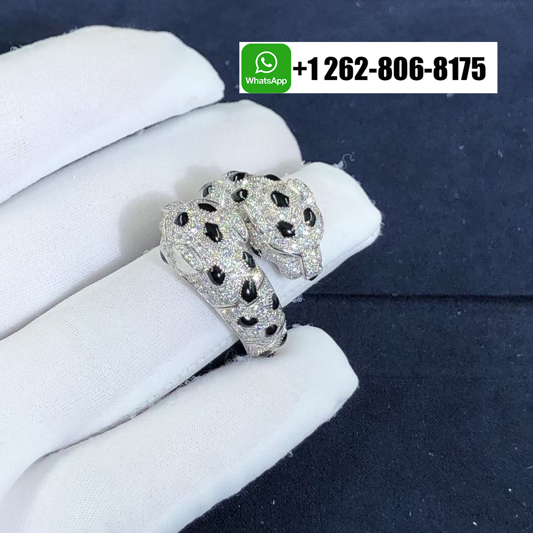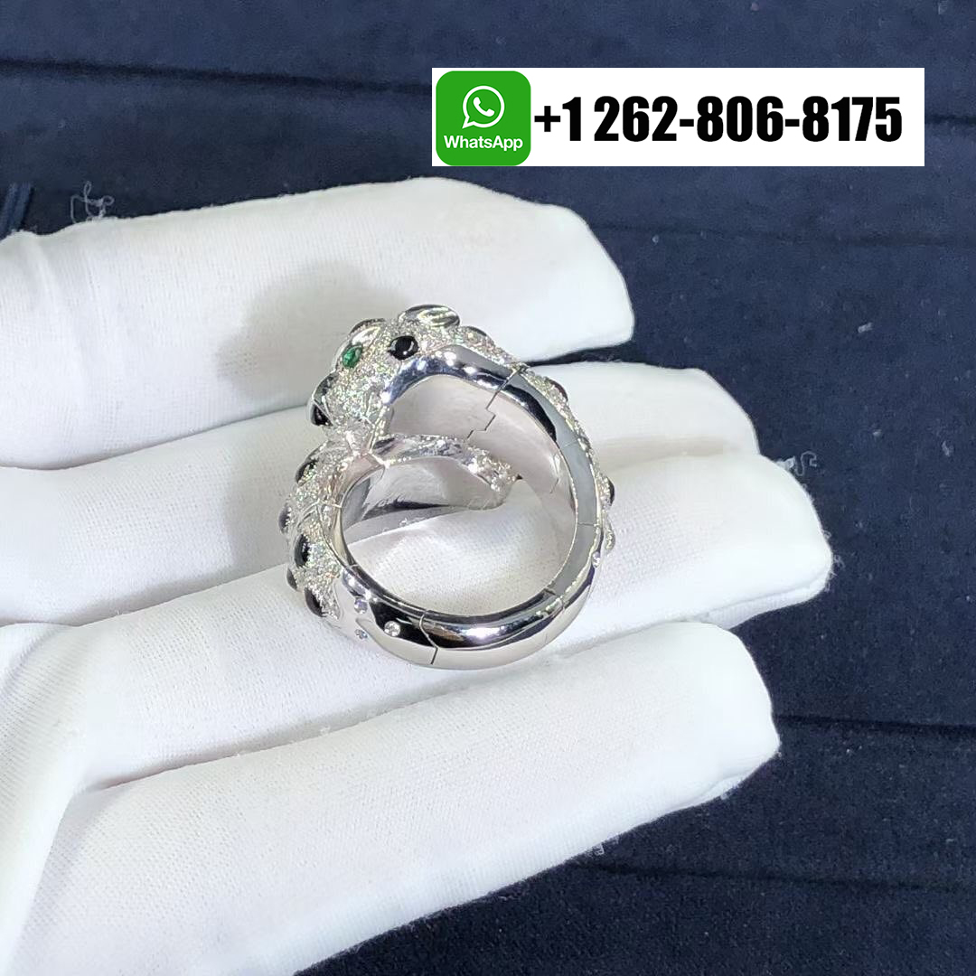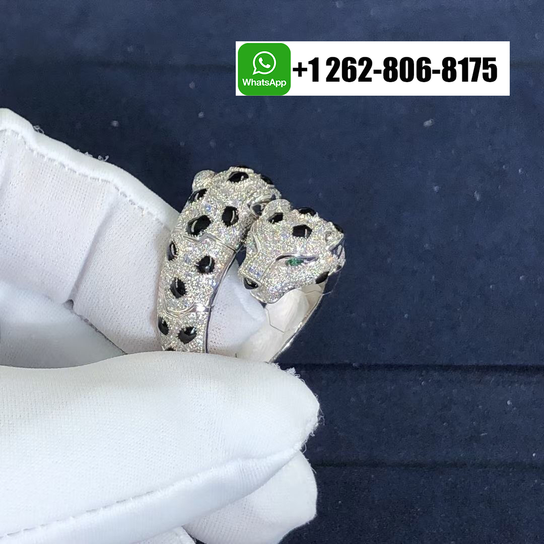 Louis Cartier introduced the Panthère in 1914, but Jeanne Toussaint – Cartier’s artistic director from 1933 to 1970 – elevated it to the fierce fashion icon it is today. The Cartier 18k White Gold Pave Diamond Double Head Panthere de Cartier Ring depending on how light dances off its 298 round diamonds, piercing emerald eyes and onyx nose, the panther appears predatory, playful or languid, infusing the white gold Panthère de Cartier ring with a multifaceted personality.