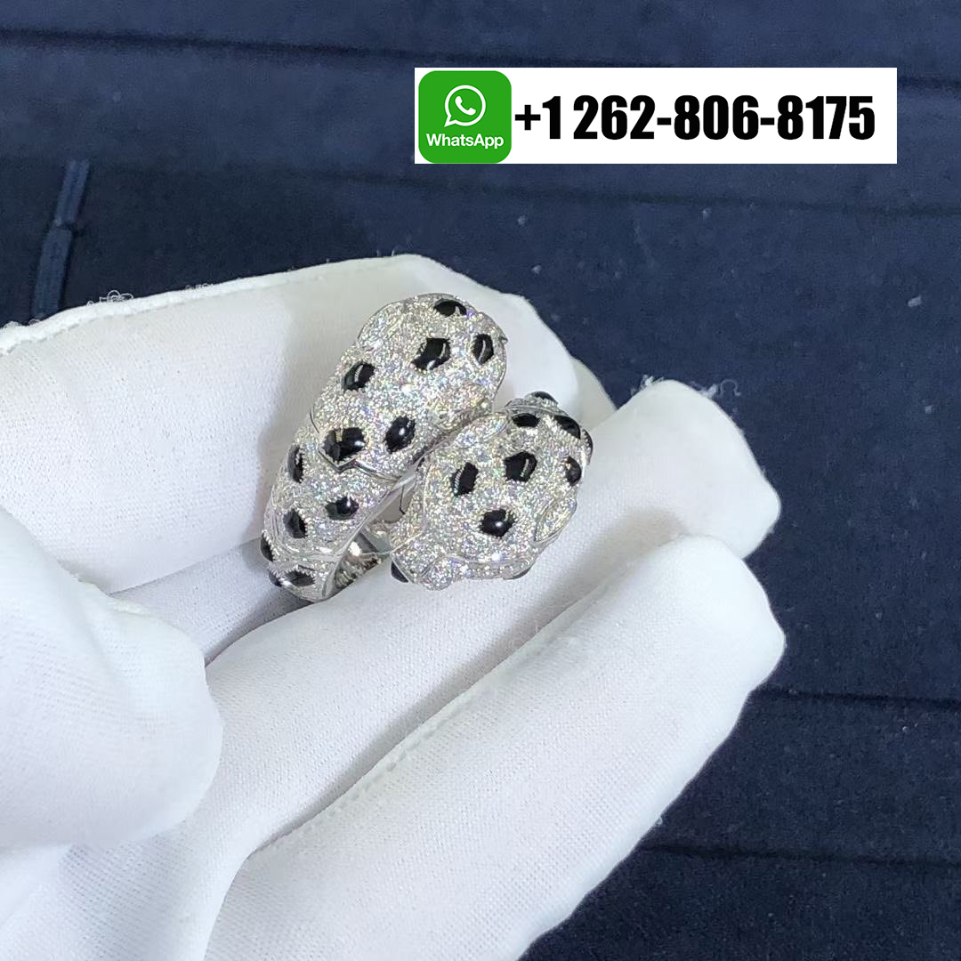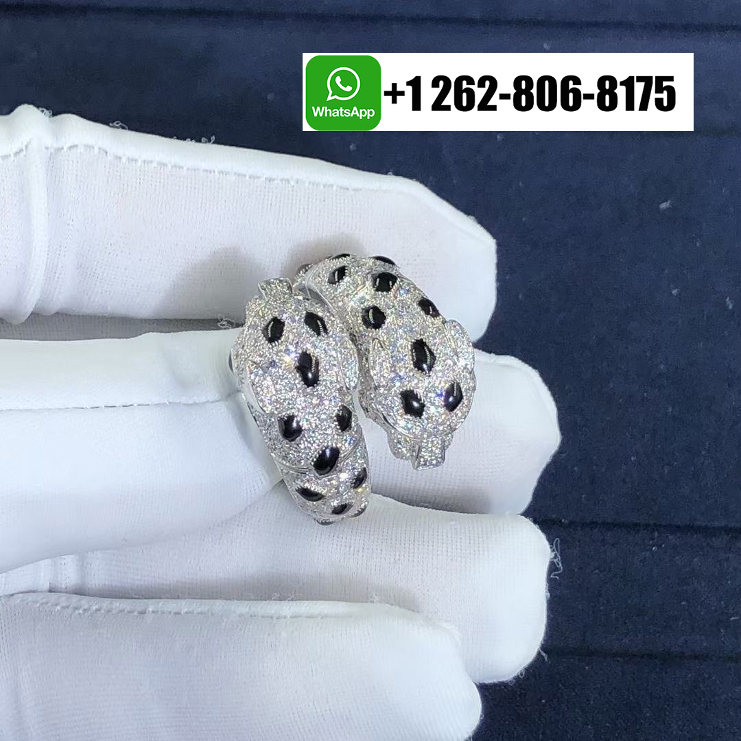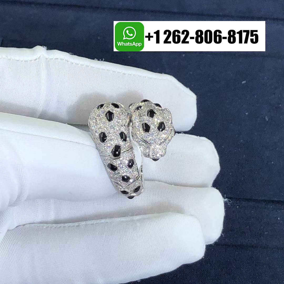 Louis Cartier introduced the Panthère in 1914, but Jeanne Toussaint – Cartier’s artistic director from 1933 to 1970 – elevated it to the fierce fashion icon it is today. The Cartier 18k White Gold Pave Diamond Double Head Panthere de Cartier Ring depending on how light dances off its 298 round diamonds, piercing emerald eyes and onyx nose, the panther appears predatory, playful or languid, infusing the white gold Panthère de Cartier ring with a multifaceted personality.