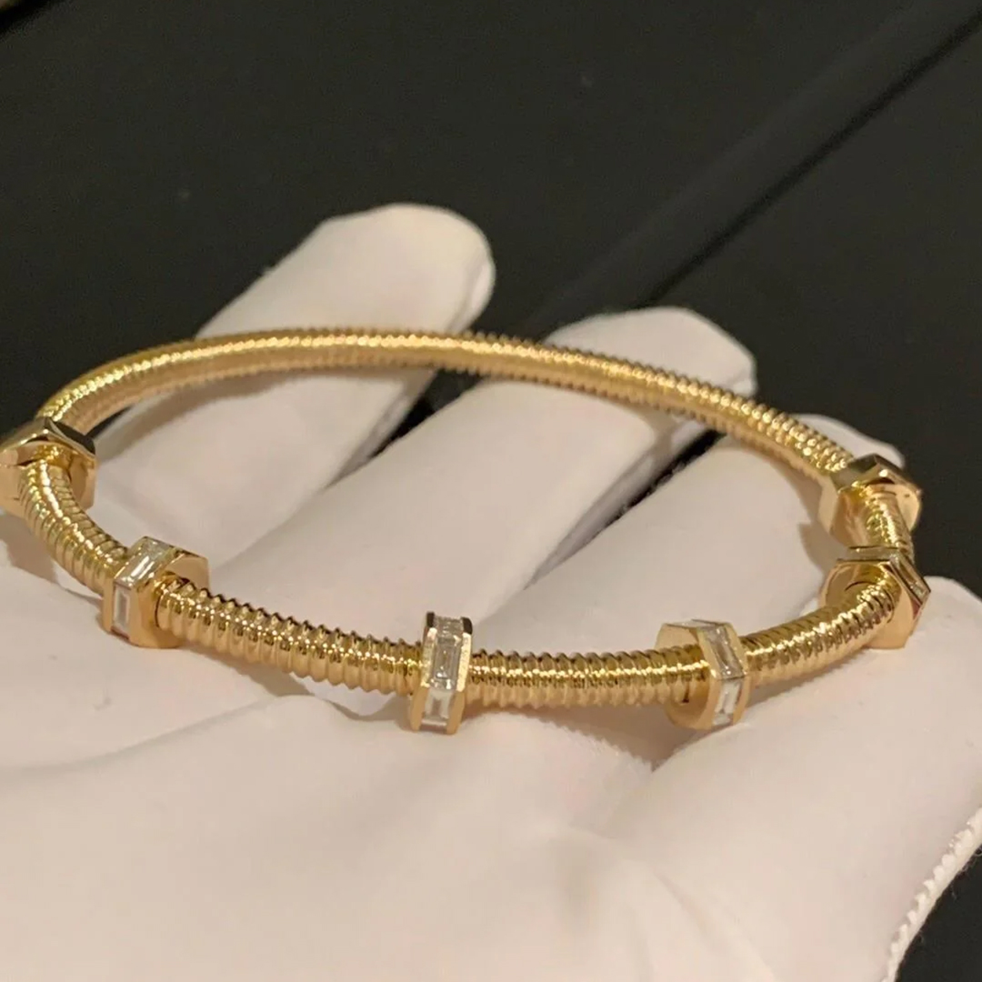 A stunning Cartier 18k Yellow Gold Ecrou De Cartier Diamond Bracelet by Cartier from the Ecrou De Cartier collection. The bracelet has a threaded design which features 6 bolts with 4 swivelling freely along one side of the bracelet, each set with 6 baguette-cut diamonds.