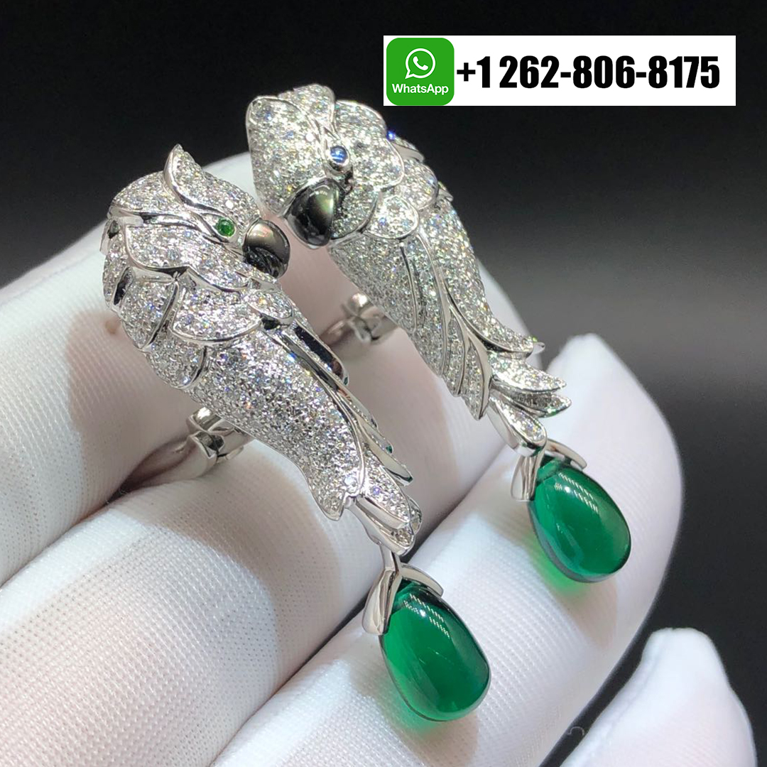 Home / Cartier Jewelry / Cartier Les Oiseau Liberes Diamond Emeralds Parrot High Jewelry Earrings in 18k White Gold