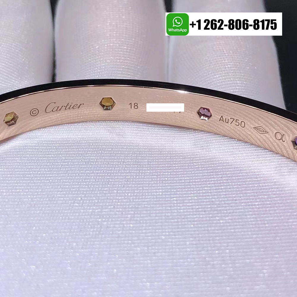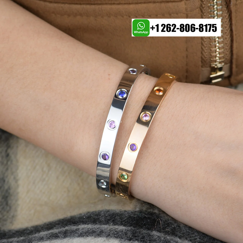 This Cartier Love Bracelet in 18K rose gold beautifully blends warmth and brilliance. Set with ten bezel-set multicolored gemstones, it creates a dazzling rainbow effect against the romantic pink hue of gold. A modern interpretation of Cartier’s signature Love design, it embodies unity, passion, and timeless luxury — an elegant statement for any occasion.