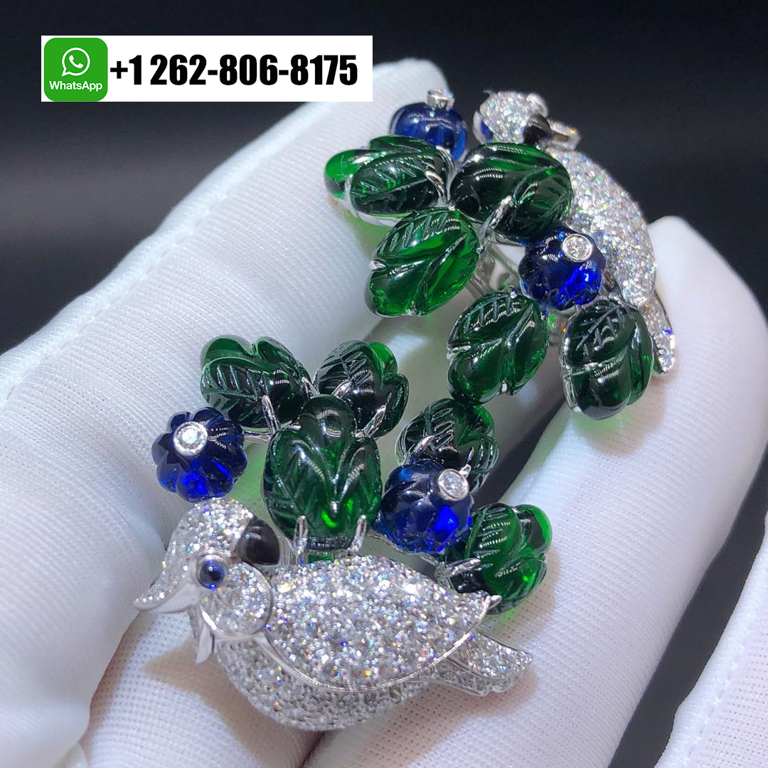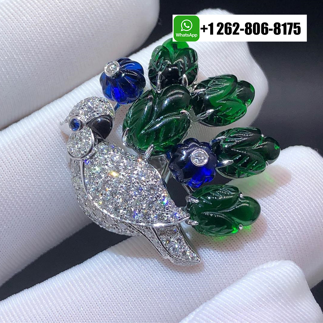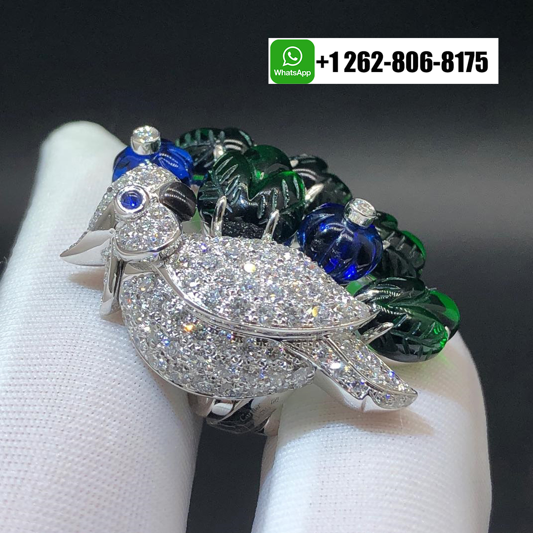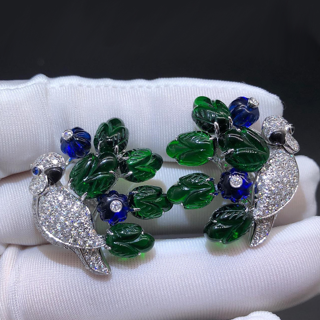 Cartier Oiseaux Liberes 18k White Gold Pave Diamond Carved Sapphires Emeralds Parrot Earrings