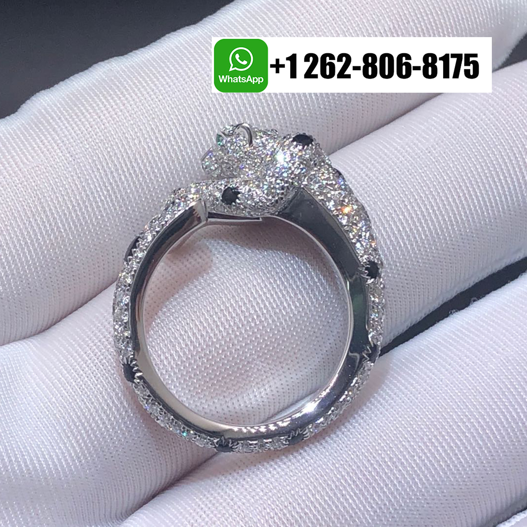 This stunning Cartier Panthere 18k White Gold Diamond Paved Onyx Ring is an exquisite piece of jewelry crafted from 18k white gold. It features a striking panther design, adorned with sparkling diamonds and deep black onyx accents.