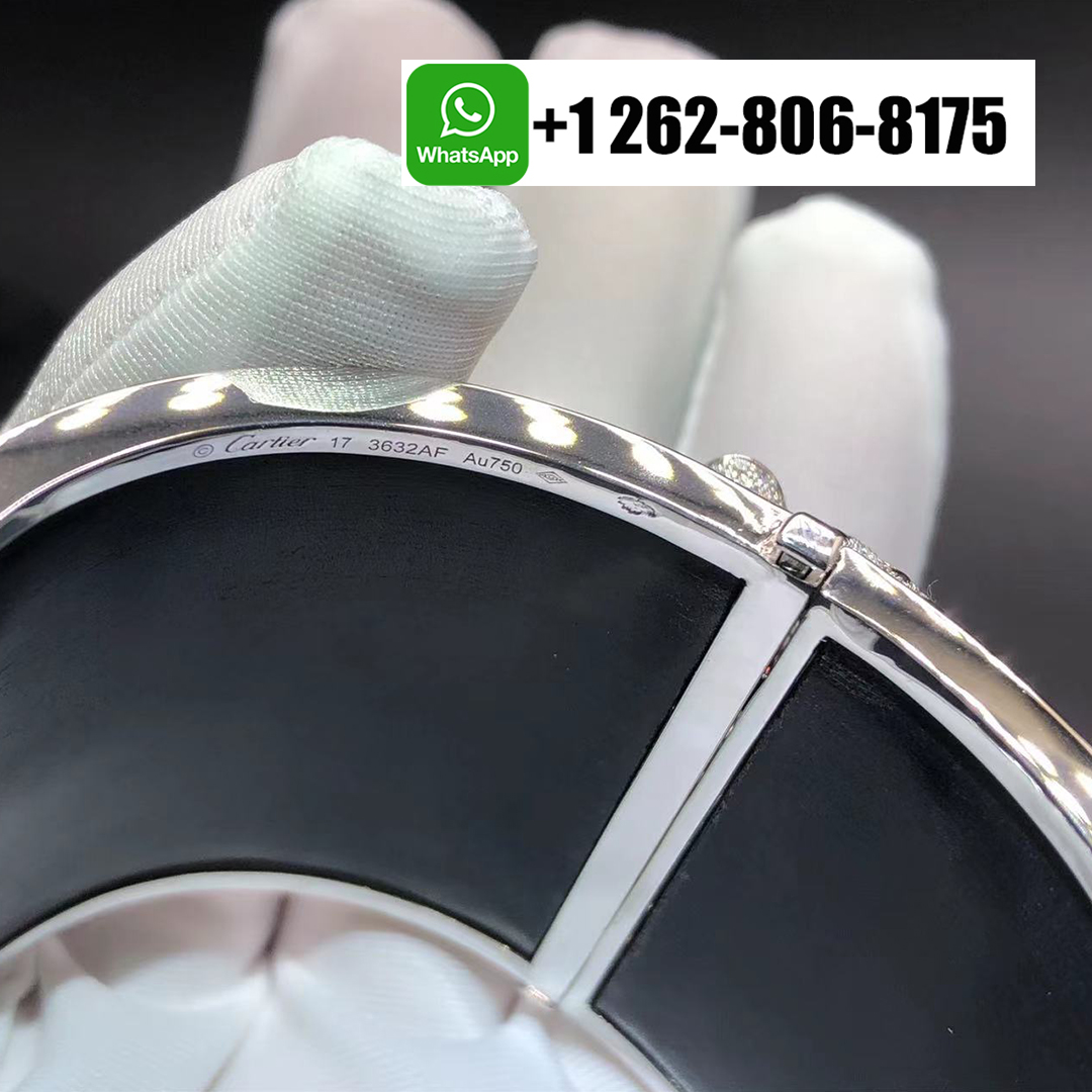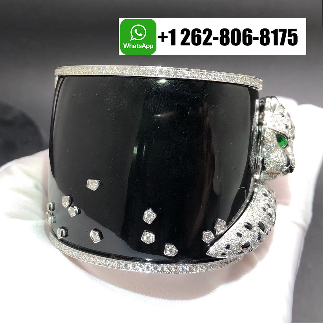 Home / Cartier Jewelry / Cartier Panthere de Cartier 18k White Gold Pave Diamonds Emeralds Onyx High Jewelry Wide Bracelet