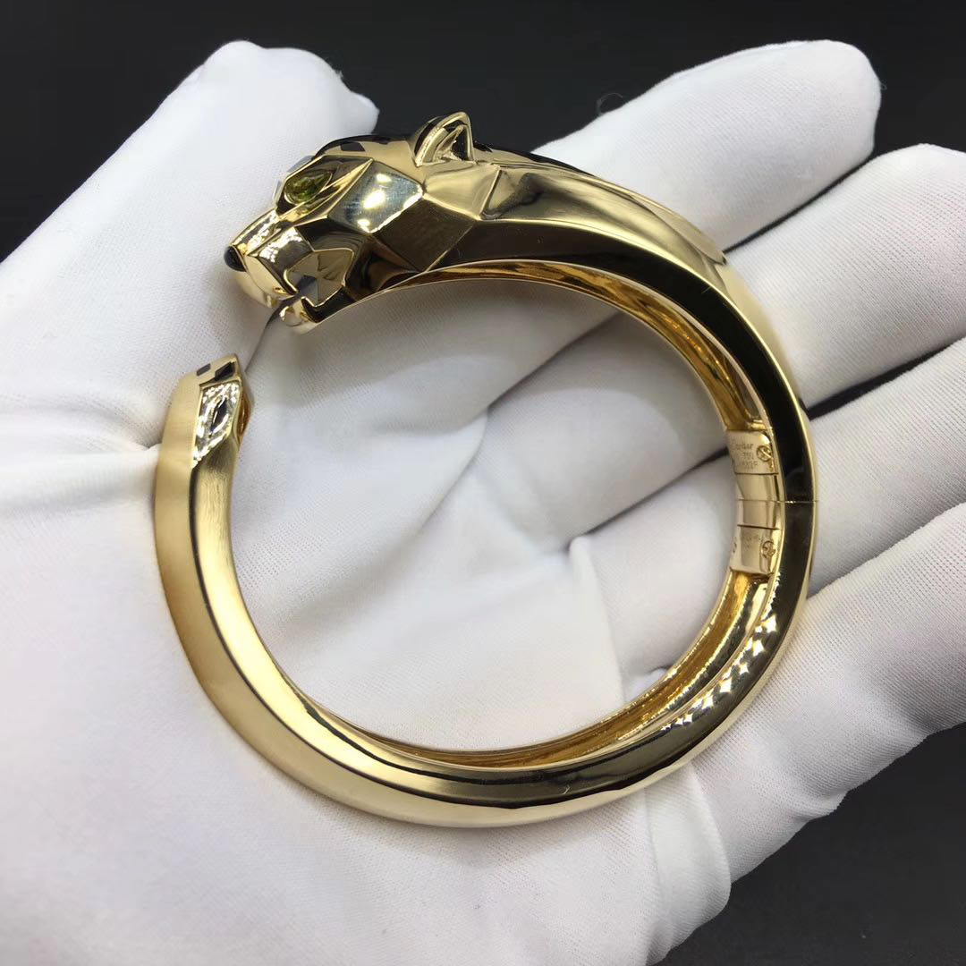A beautiful Cartier Pure 18k Yellow Gold Black lacquer Tsavorite Garnets Panthère de Cartier Bracelet crafted in 18ct yellow gold, with two pear-shape Tsavorite Garnets set as eyes and onyx inlay design. The panthere bangle has an oval profile with a twist-hinged design to be put on with ease and remain secure.