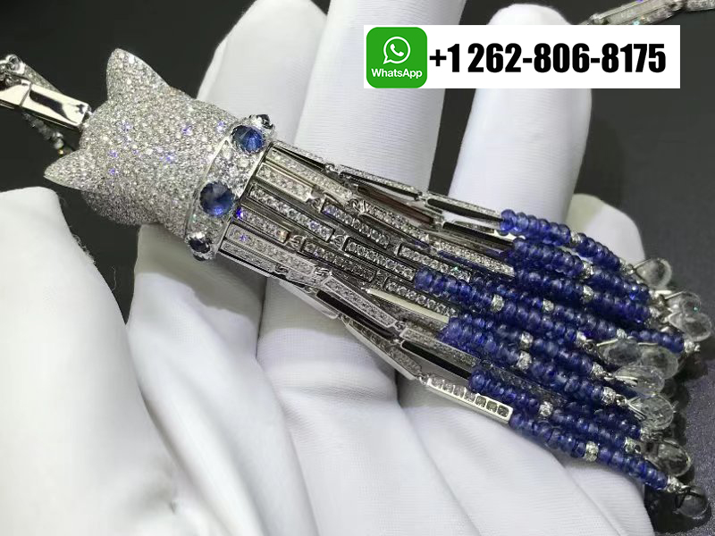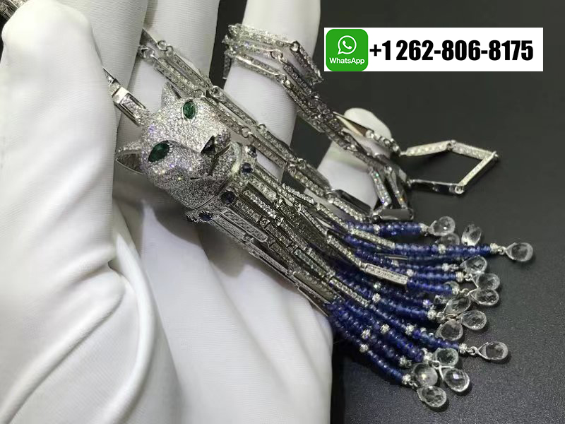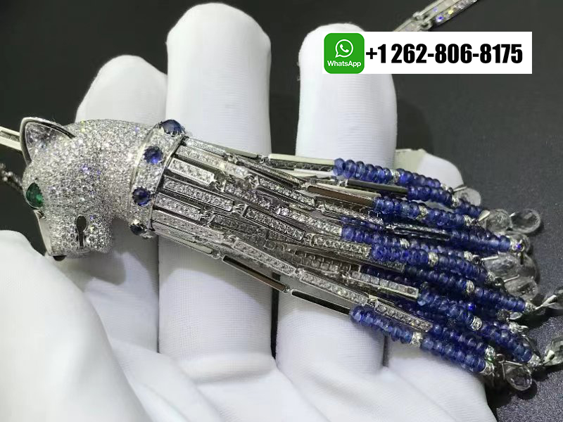 Home / Cartier Jewelry / Cartier Necklaces / Cartier Panthere de Cartier High Jewelry Tassel Necklace 18K White Gold Blue Sapphires Diamond Paved Emeralds