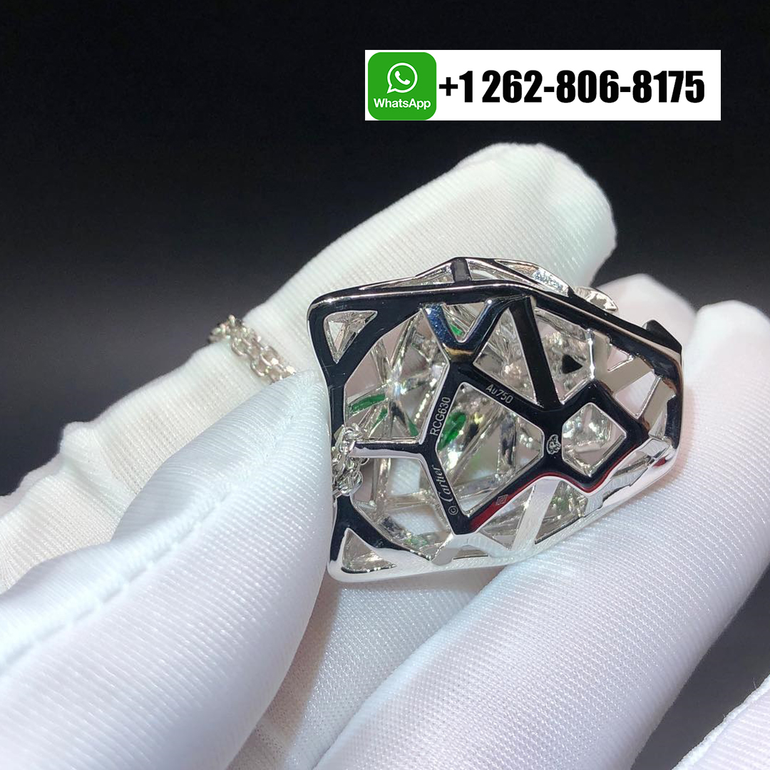 A stunning Cartier Panthère de Cartier Openwork Necklace in solid 18k white gold. This elegant piece showcases Cartier’s most iconic motif—the panther—rendered in geometric openwork white gold and set with two pear-cut tsavorite garnet eyes. Versatile and refined, the pendant can be worn on a variety of occasions. Once around the neck, the panther motif stands out beautifully, with the vivid tsavorites adding a subtle yet captivating sparkle.