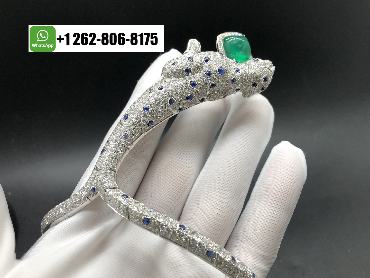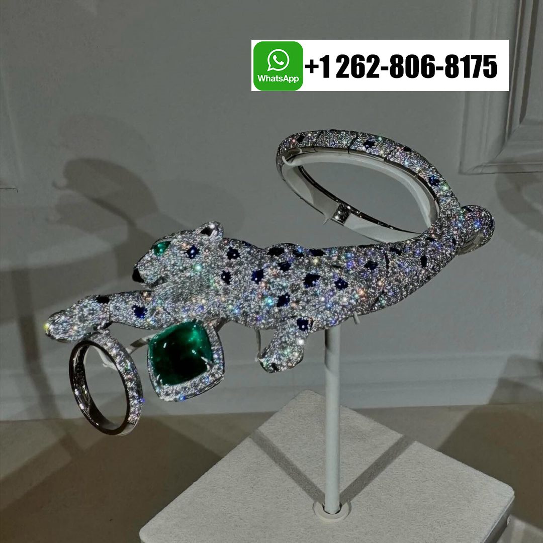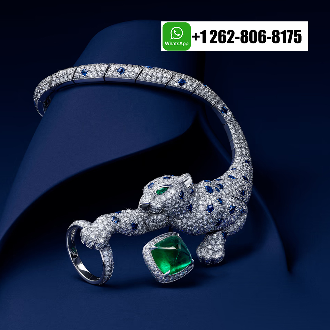 Home / Cartier Jewelry / Cartier Panthère Jaillissante Blue Sapphires Emerald High Jewelry 18k White Gold Full Pave Diamond Ring-Bracelet