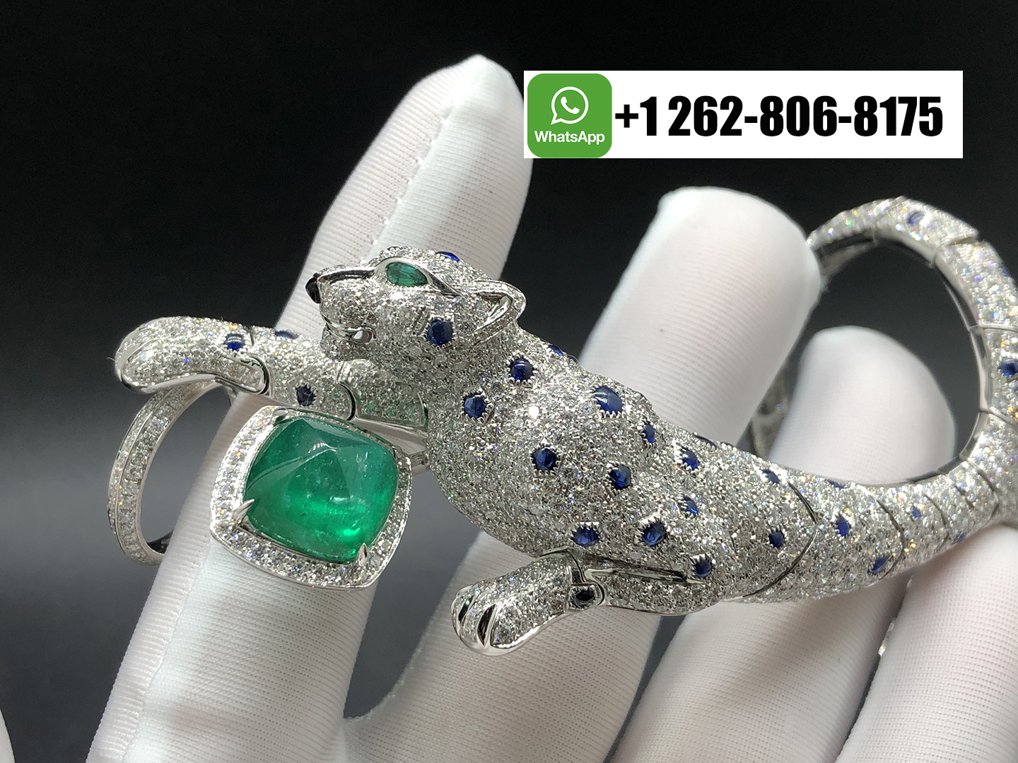 Cartier Panthère Jaillissante Blue Sapphires Emerald High Jewelry 18k White Gold Full Pave Diamond Ring-Bracelet