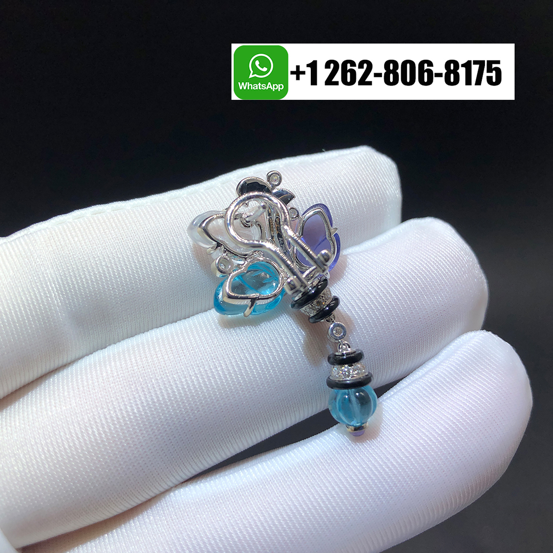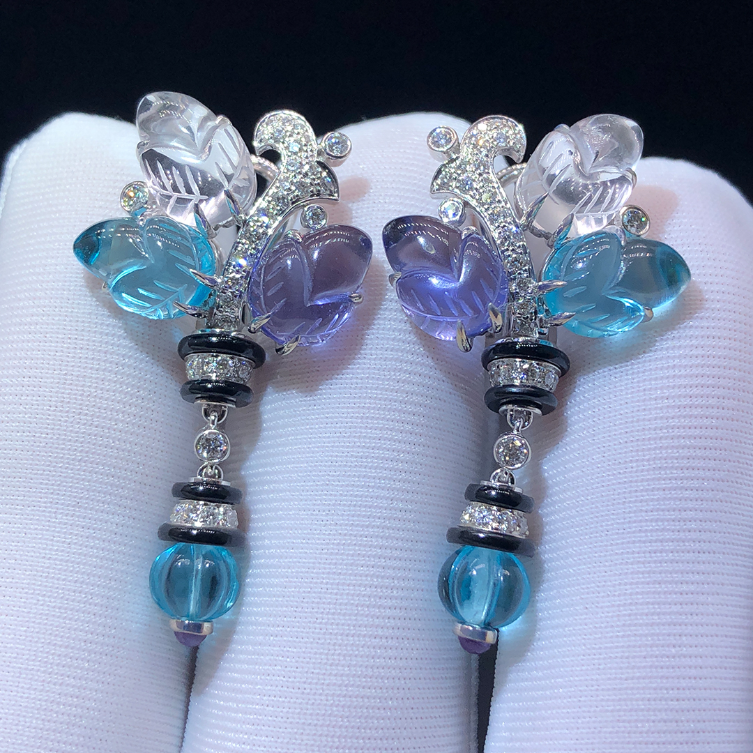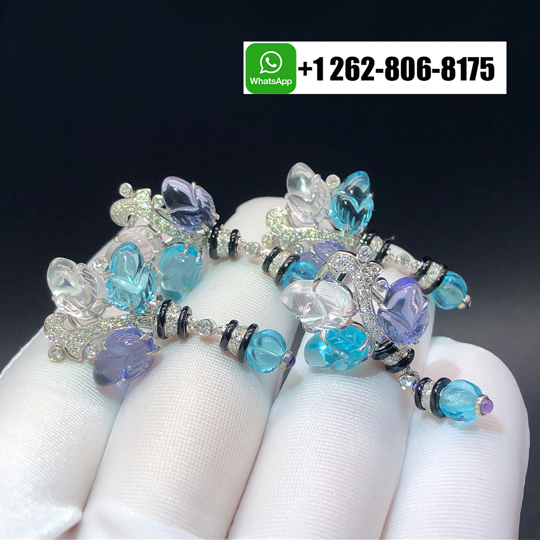 These Cartier Pierres Gravées Tutti Frutti High Jewelry Earrings in 18K white gold capture the enchanting harmony of color and light. Each earring features four exquisitely carved aquamarines, four tanzanites, and two moonstones, beautifully accented with onyx details. Each earrings adorned with 41 brilliant-cut diamonds totaling 0.68 carat, the design evokes a poetic garden of gemstones — radiant, refined, and artfully sculpted in Cartier’s timeless high jewelry tradition.