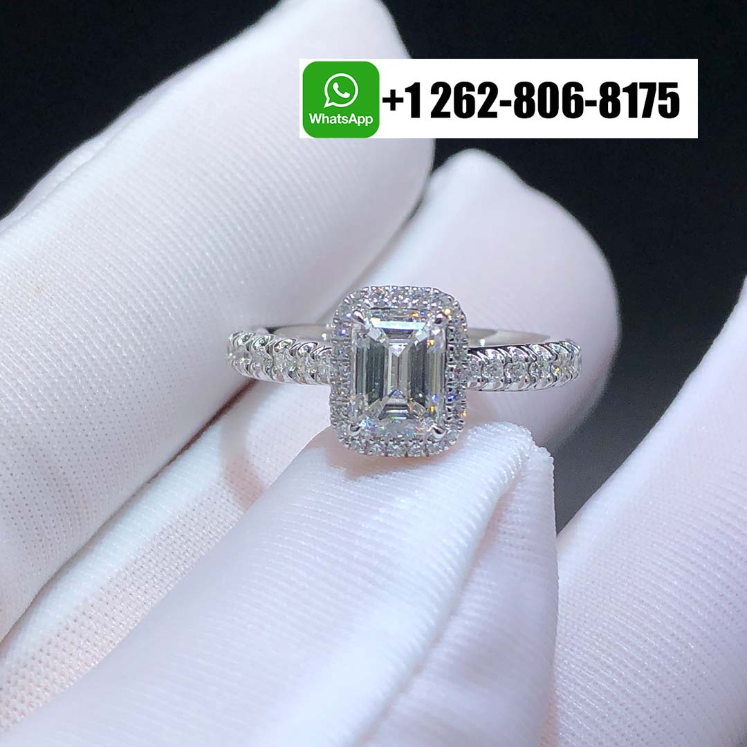 This exquisite Cartier Platinum GIA 1.01ct Diamond Emerald Cut Destinée Solitaire Engagement Ring is crafted of platinum and features an emerald cut center diamond weighing a total of 1.01 carats with GIA certificate. The Destinée Solitaire Engagement Ring also features a halo and half pave set band weighing 0.56 total carat weight.