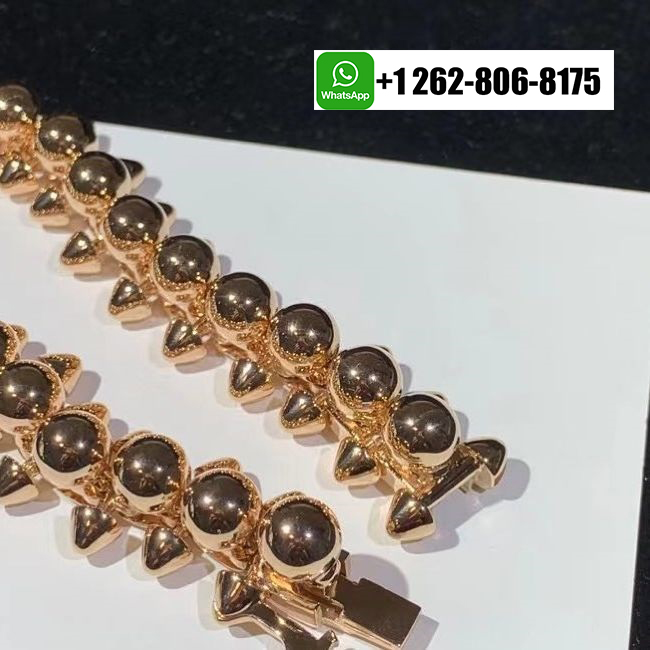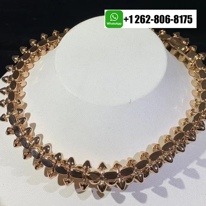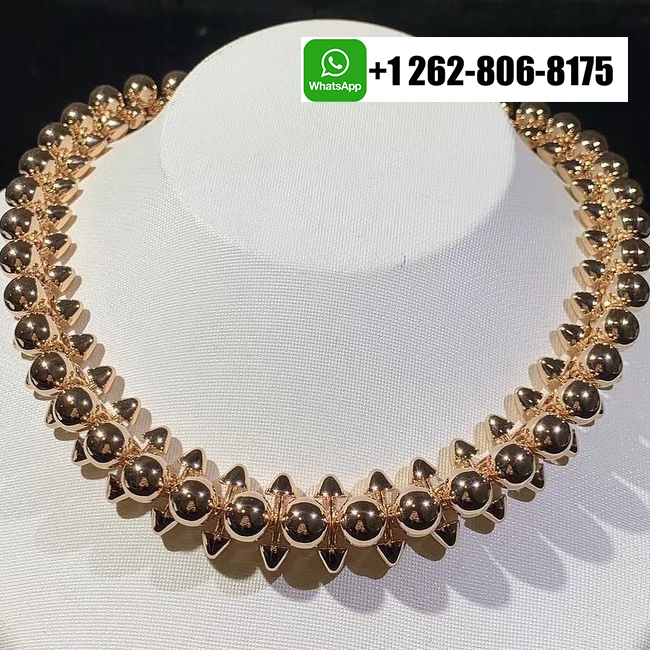 The Cartier Clash de Cartier necklace XL model in 18K pink gold embodies bold elegance and sculptural precision. Its distinctive design features a rhythmic pattern of polished studs and rounded beads, creating a captivating interplay of light and texture. The statement silhouette rests gracefully along the neckline, balancing modern edge with refined sophistication. A true emblem of Cartier’s duality—rebellious yet feminine—this masterpiece celebrates individuality through its daring geometry and luxurious craftsmanship.