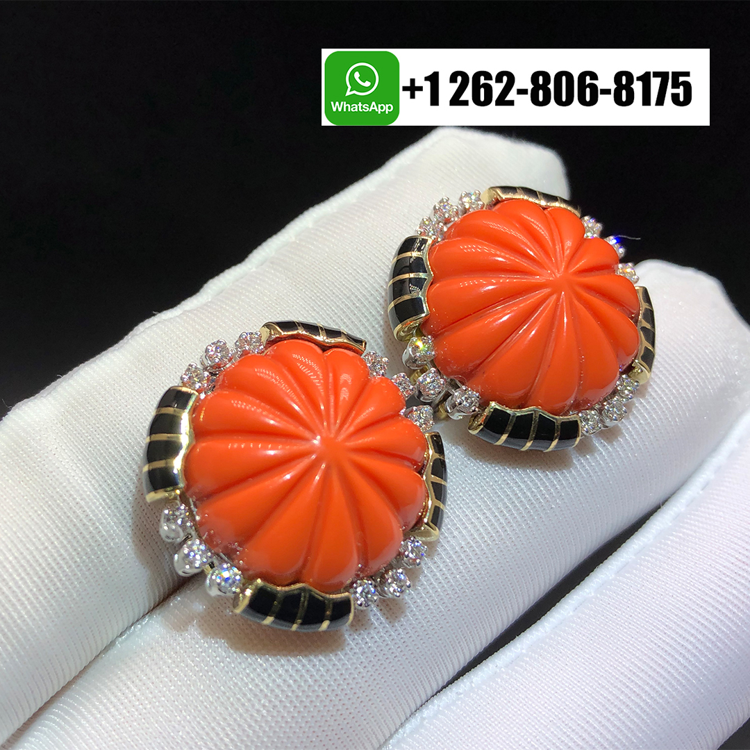 Capture the essence of elegance and sophistication with these exquisite David Webb 18K Yellow Gold and Platinum Carved Coral Bombe Diamond Earrings. Designed for the modern woman who appreciates fine craftsmanship and distinctive style, these earrings are a true work of art. The centerpiece of each earring is a beautifully fluted carved coral, a testament to David Webb's attention to detail and artistic vision. Surrounding the coral are sparkling round brilliant-cut diamonds, with a total weight of approximately 0.56 carats. The diamonds add a touch of brilliance and enhance the overall allure of the earrings. To further enhance their allure, delicate black enameling highlights the intricate details, creating a stunning contrast against the precious metals. Crafted in a combination of 18 karat yellow gold and platinum, these earrings exude a sense of luxury and timeless beauty. Whether you prefer pierced or non-pierced earrings, these versatile earrings cater to your needs. The posts fold down, allowing you to wear them as clip-on earrings as well.