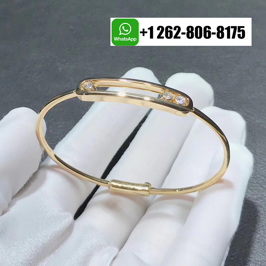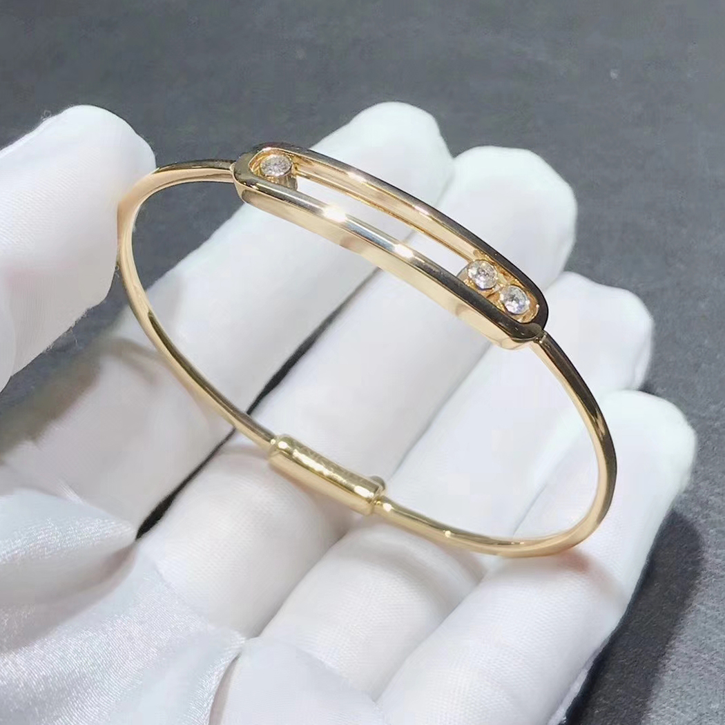 This elegant Messika Jonc Move Diamond Bracelet in 18k yellow gold embodies refined minimalism and modern luxury. The sleek, open bangle design features three brilliant-cut diamonds in motion, symbolizing love’s past, present, and future. Crafted with signature Messika precision, its clean lines and fluid form make it perfect for everyday sophistication or layered with other Move creations for a contemporary, radiant look.