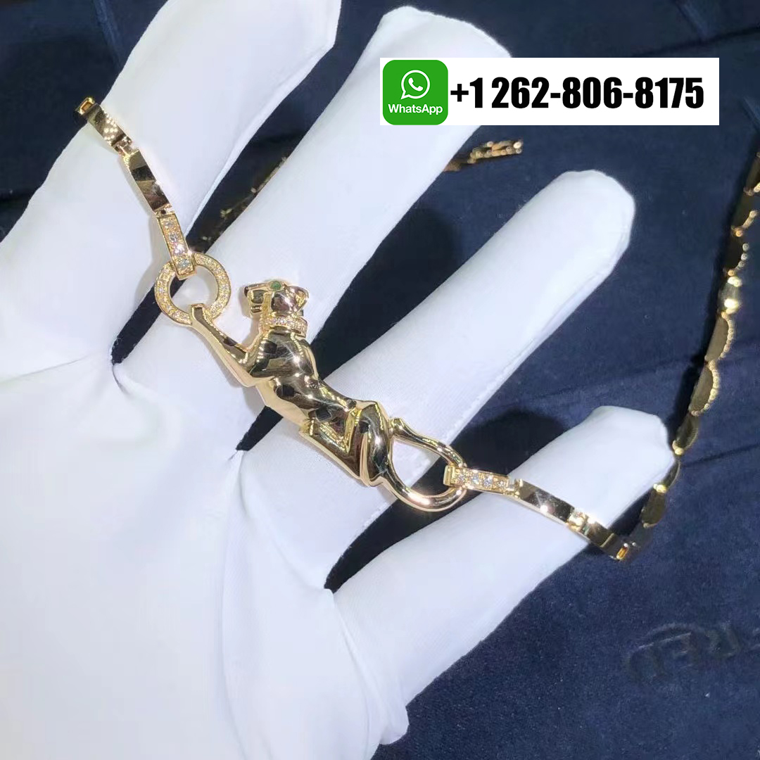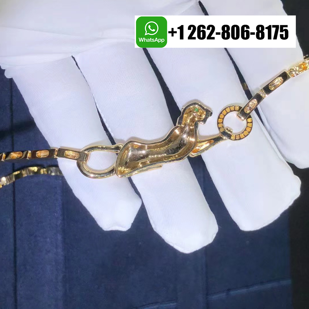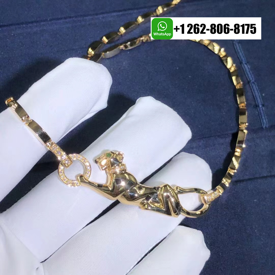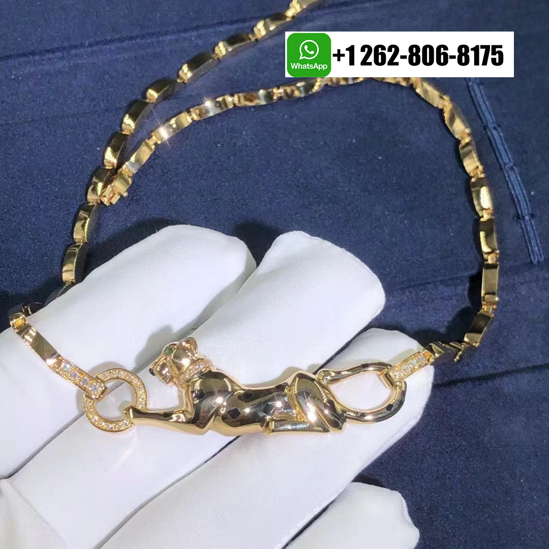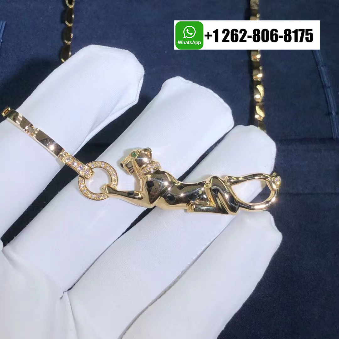 A striking Cartier Panthère de Cartier necklace in 18k yellow gold with Tsavorite garnet, onyx, black lacquer. This elegant piece showcases the iconic panther motif, detailed with bold black lacquer spots, a vivid tsavorite garnet eye, and an onyx nose. Adorned with 32 round brilliant-cut diamonds totaling approximately 0.23 carats, the motif measures 2.5 inches in length and is gracefully suspended from a link chain with a secure push clasp and figure-8 safety.