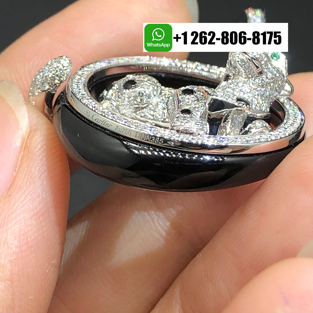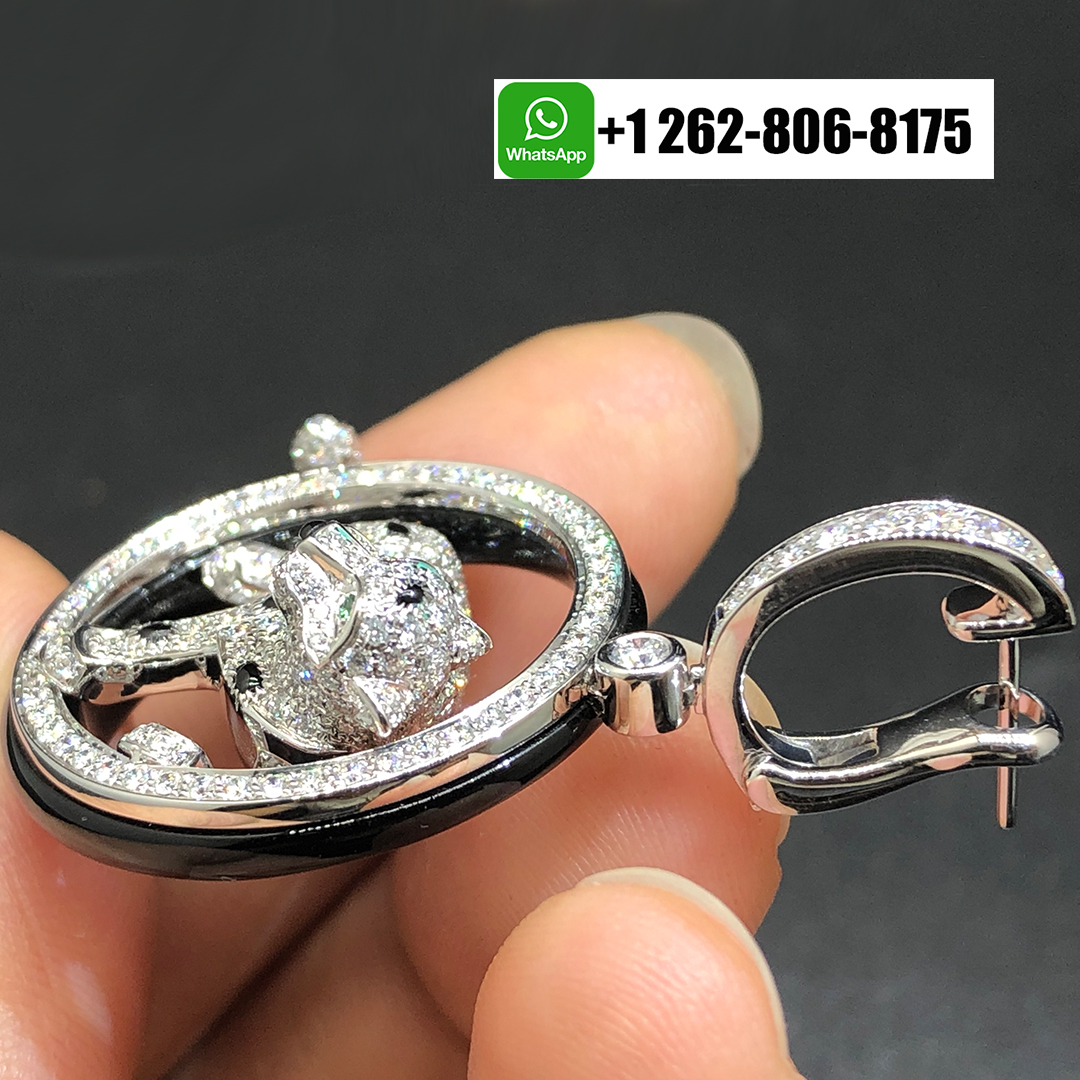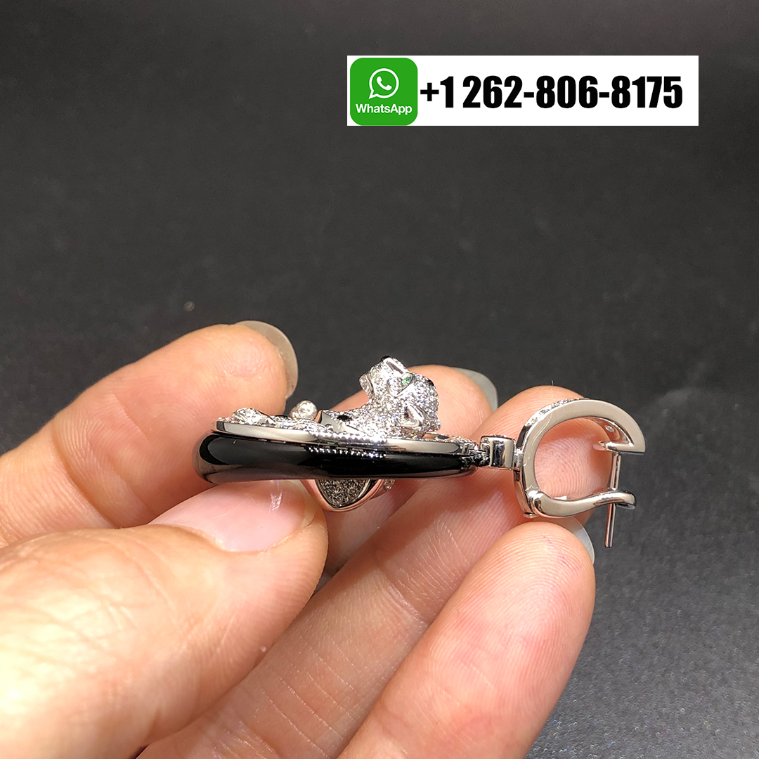 These Panthère de Cartier Pave diamonds Black Nephrite Jade earrings in 18k white gold exude bold sophistication and meticulous artistry. Each earring is set with black nephrite jade, two piercing emerald eyes, an onyx nose, and 27 onyx spots, highlighting the panther’s captivating allure. Adorned with 335 brilliant-cut diamonds totaling 5.13 carats, they radiate brilliance and strength—an iconic creation that celebrates Cartier’s legendary craftsmanship and timeless elegance.