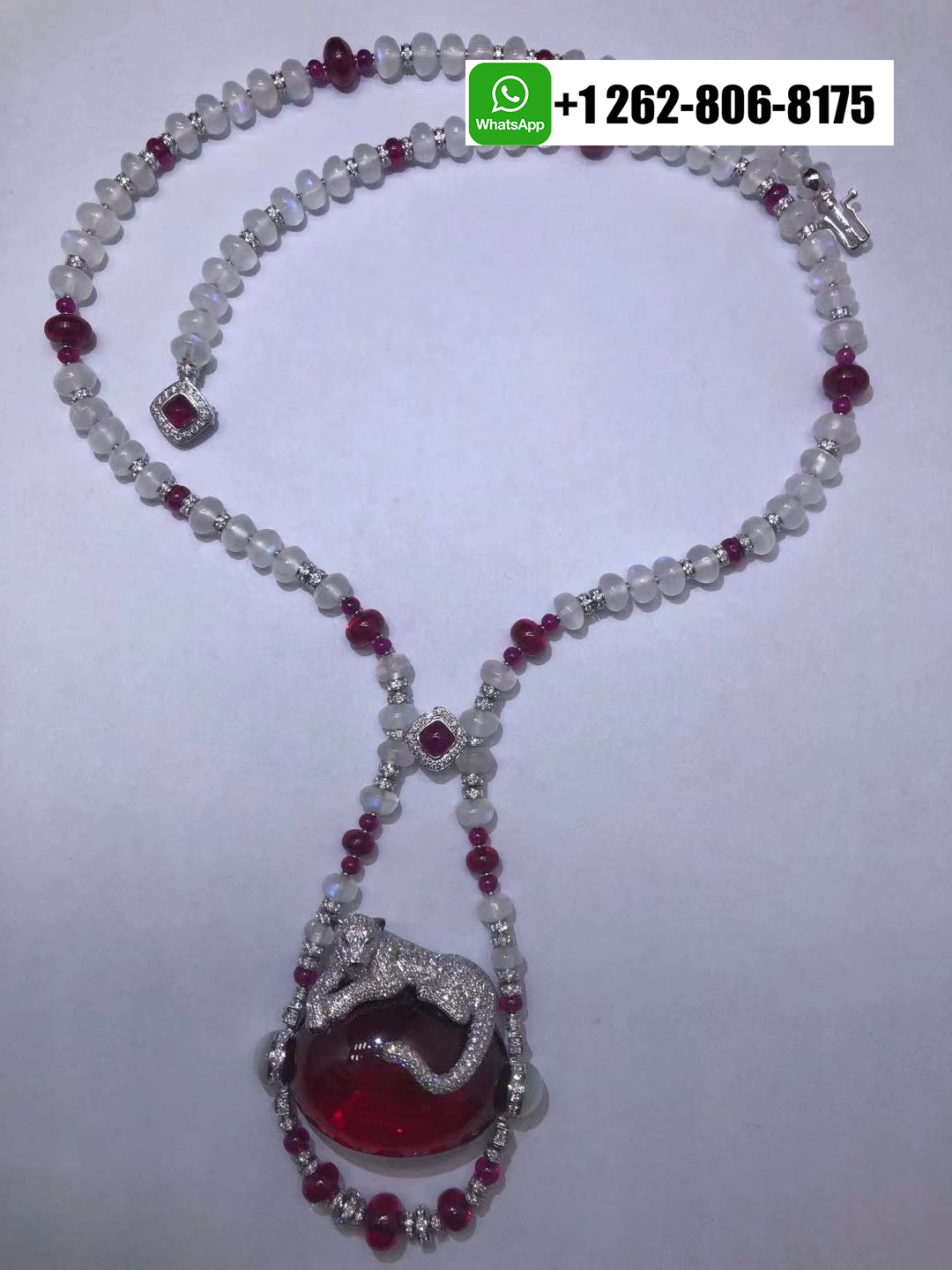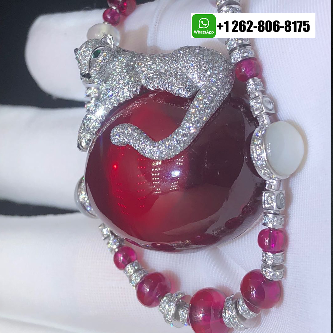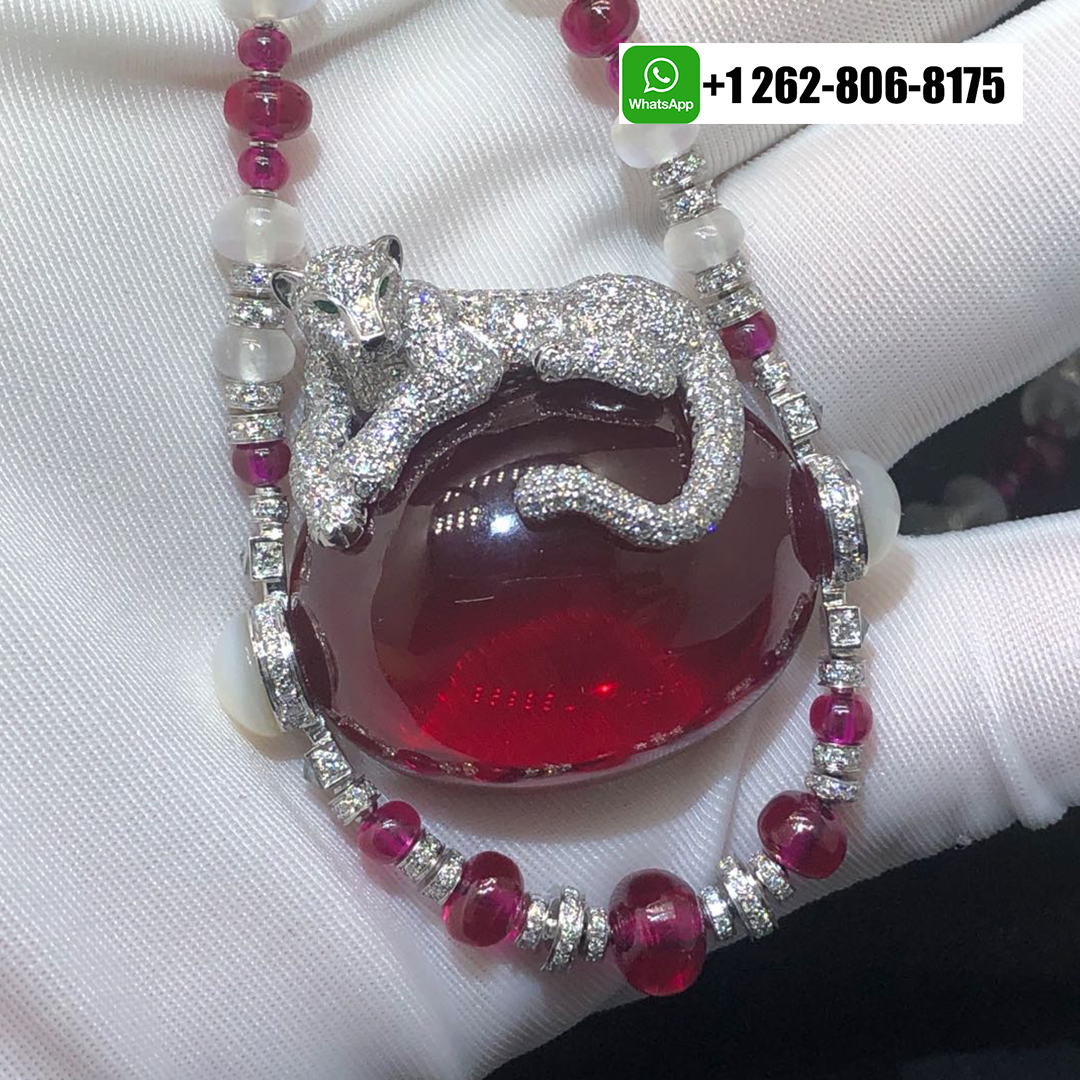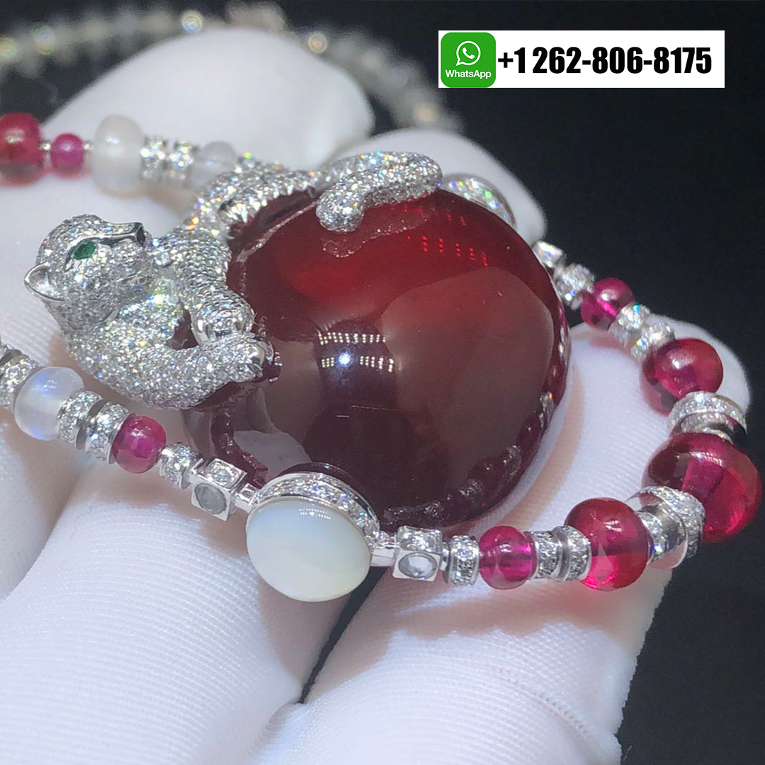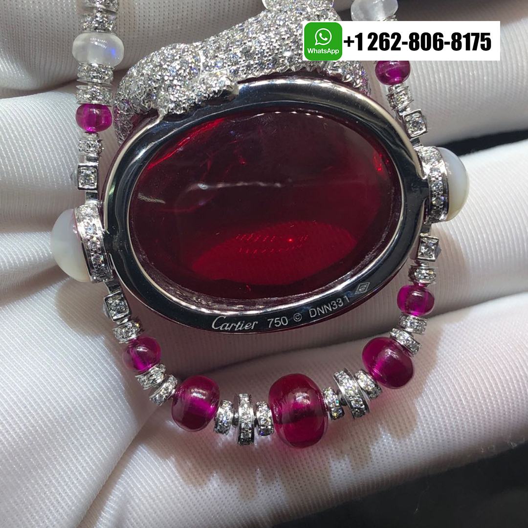 A magnificent Panthère de Cartier High Jewelry Necklace in 18k white gold, showcasing a sculpted panther gracefully resting on a deep rubellite cabochon. The necklace is composed of moon quartz and ruby beads (The main rubellite is 194.24-carat cabochon-cut rubellite), accented with diamonds, emeralds, and onyx details, exemplifying Cartier’s signature blend of elegance, artistry, and fierce sophistication.