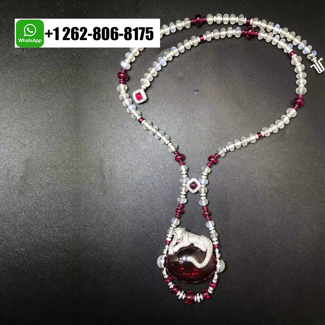 Home / Cartier Jewelry / Panthere de Cartier Rubellite Moon Quartz Beads Emeralds Onyx High Jewelry Necklace 18k White Gold