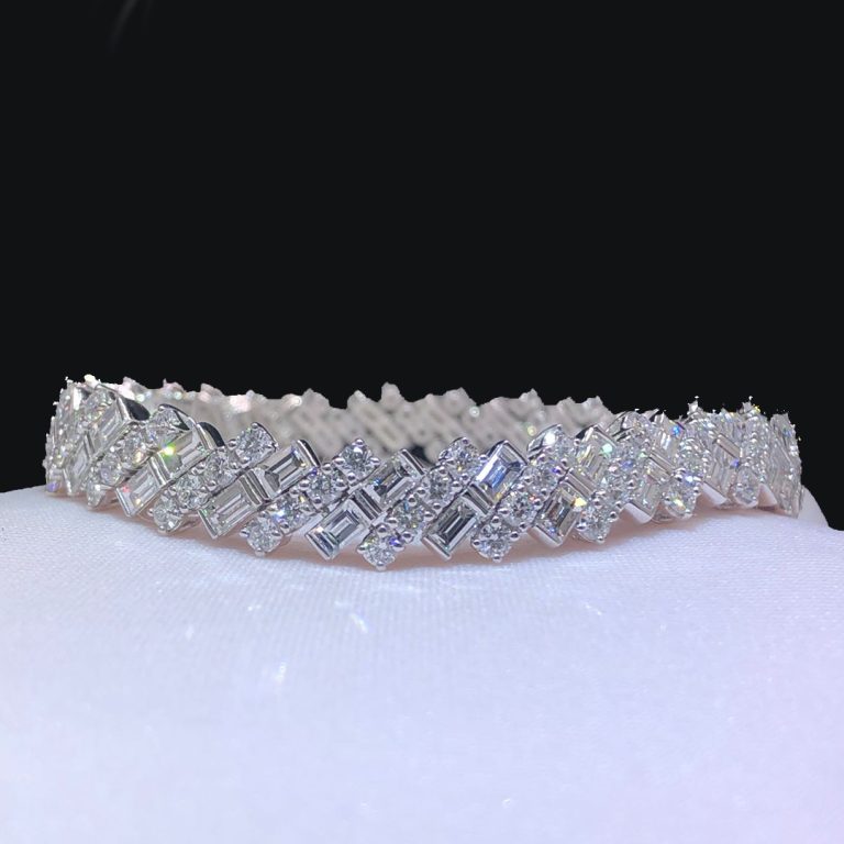 This gorgeous Cartier Reflection de Cartier Diamond High Jewelry Bracelet in 18k White Gold is set with 92 brilliant-cut diamonds totalling 3.96 carats, and with 46 baguette-cut diamonds totalling 4.96 carats. Total carat weight 8.92 carats. Metal: 18k white gold (Weight is about 25.5g in size 17) Diamonds: 92 brilliant-cut diamonds 3.96ct, 46 baguette-cut diamonds 4.96ct (Size 17) Diamond Quality: G color VVS Band Width: 11mm Ref.: H6012717 Please contact Lexga to get the factory direct wholesale price Looking for 100% exactly same quality as authentic Custom Made Cartier Jewelry in diamond and real 18k gold or platinum? Look no further than […]