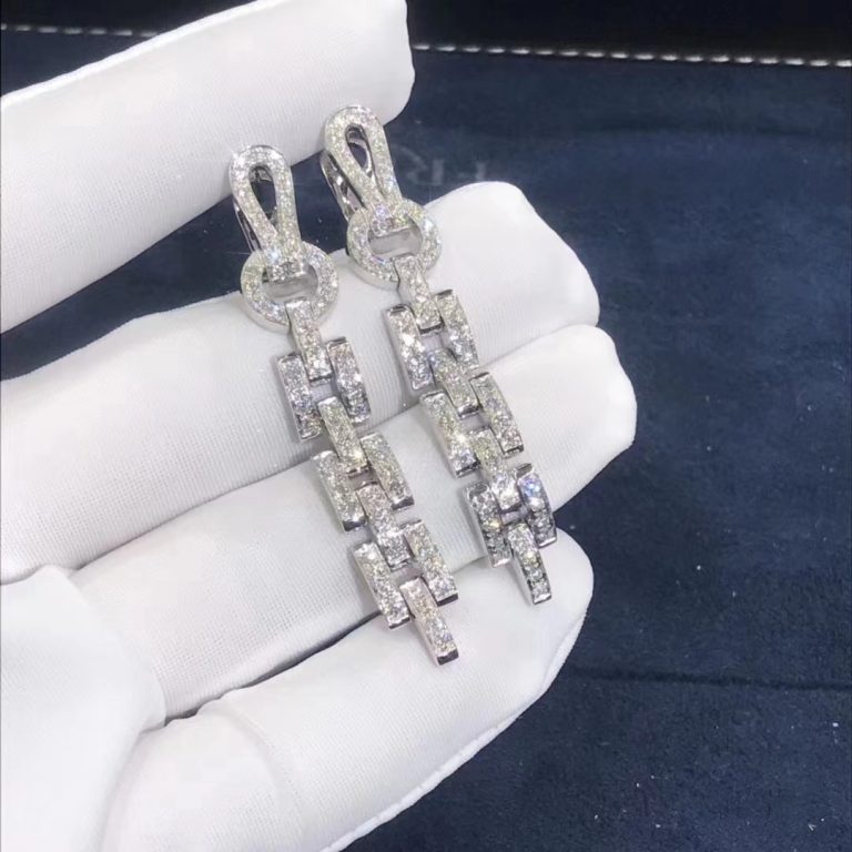 These Cartier Évasions Joaillières earrings in 18K white gold exude architectural elegance and radiant sophistication. The elongated silhouette features a mesmerizing geometric pattern fully pavéd with brilliant diamonds, reflecting light with dazzling intensity. At the base, two luminous cultured pearls lend a soft contrast to the structured design, while delicate diamond drops add graceful movement. A testament to Cartier’s artistry, these earrings harmonize modern geometry with timeless luxury and feminine allure. Metal: 18k white gold (Weight is about 34.85g a pair) Diamonds: 502 brilliant-cut diamonds 6.35ct Pearl: 2 cultured pearls diameter 7.5mm Earrings Size: 10.8cm long and 1.6cm width WhatsApp: […]