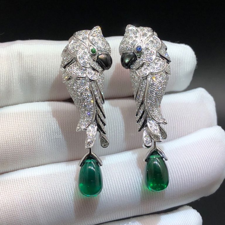 These magnificent Cartier Oiseaux Libérés Parrot Earrings are crafted in 18k white gold, radiating opulence and elegance. Each parrot is meticulously set with pavé diamonds, featuring a grey mother-of-pearl beak and captivating eyes — one with an emerald and the other with a blue sapphire. The design is completed with striking cabochon drop emeralds, adding movement and vivid color. A true testament to Cartier’s artistry, these earrings embody freedom, grace, and timeless sophistication. Metal: 18k white gold (Weight is about 20.6 g) Diamonds: 372 brilliant-cut diamonds 1.92ct Gemstones: 2 grey mother-of pearl beak, 1 emerald eye, 1 sapphire eye, 2 […]