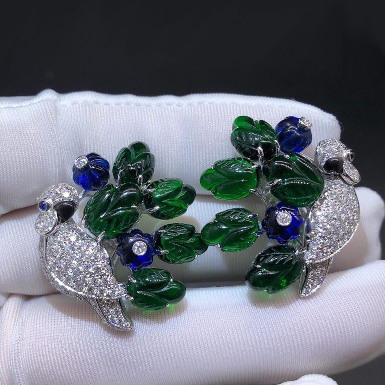 These exquisite Cartier Oiseaux Libérés earrings are a celebration of nature’s beauty and Cartier’s artistry. Crafted in 18k white gold, each parrot shimmers with pavé-set diamonds and features eyes of onyx and sapphire. Surrounding them are intricately carved emerald leaves and sapphire blossoms, creating a vivid, lifelike composition. A masterpiece of high jewelry craftsmanship, these earrings embody freedom, elegance, and vibrant color harmony in true Cartier style. Metal: 18k white gold (Weight is about 25g a pair) Diamonds: 3.18ct a pair Gemstones: 8 Carved Emearlds, 4 Carved Sapphire and 2 Grey Mother of Pearl beak, 2 sapphire eyes Earring Size: […]
