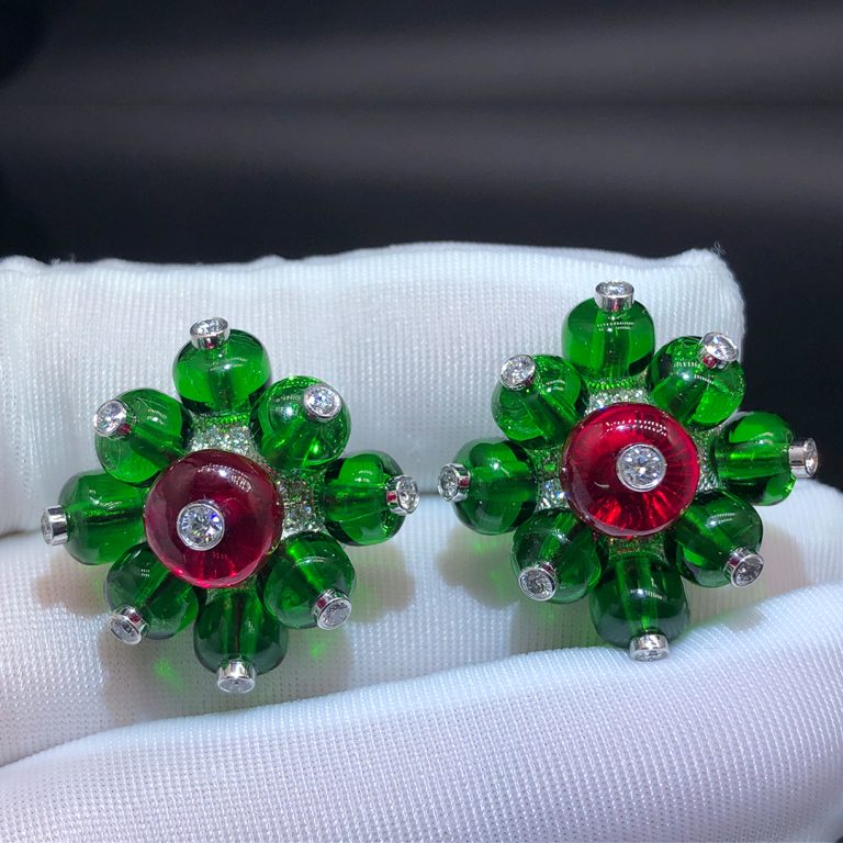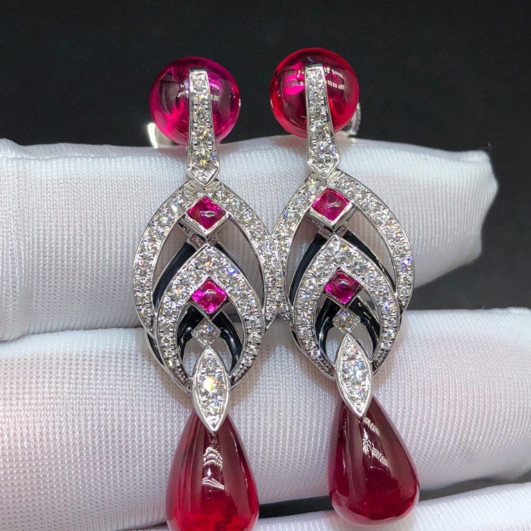 A gorgeous Cartier Rubellite Black Lacquer Diamond Paved 18k Whtie Gold High Jewellery Drop Earrings from the Cartier high jewellery collection. The earrings are crafted of 18k white white gold with two rubellite drops, 2 rubellite beads, 4 cabochon-cut rubellites, black lacquer and pave diamonds. Metal: 18k white gold (Weight is about 14.5g) Diamonds: 90 round diamonds 1.52ct Gemstones: rubellite, black lacquer Earring Size: 13.2mm * 43mm REF.: H8000282 WhatsApp: +1 262-806-8175 Please contact Lexga to get the factory direct wholesale price Looking for 100% exactly same quality as authentic Customized Replica Cartier Earrings? Look no further than Lexga. We […]