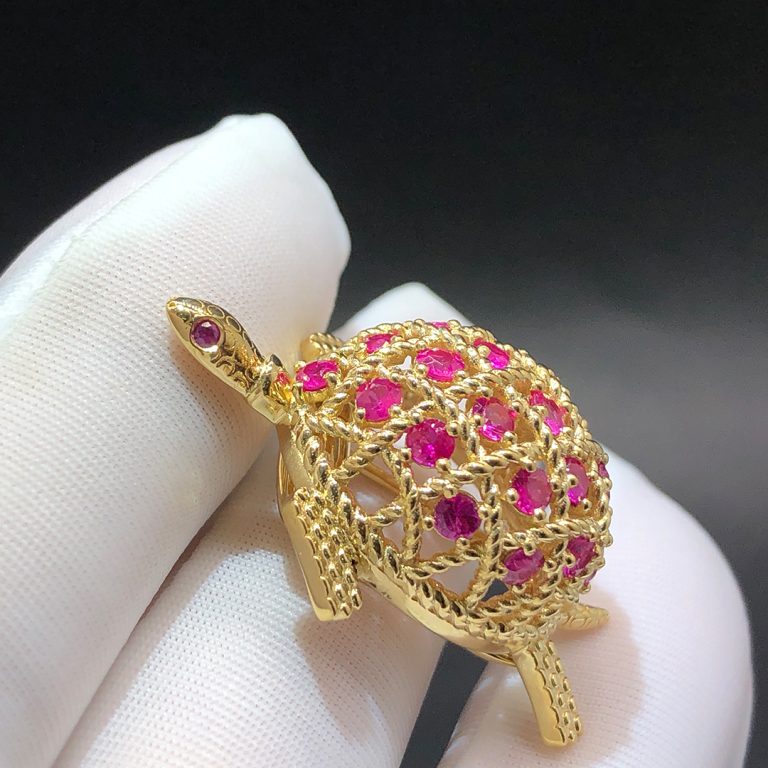 CARTIER Lapel clip brooch in 18K yellow gold, representing a turtle whose carapace in grating of twisted gold threads is set with rubies. Eyes adorned with ruby. 18K yellow gold pins with toggle safety system. Metal: 18k yellow gold (Weight is about 12.2g) Gemstones: 26 rubies 1.87ct Size: 36 mm x 24 mm WhatsApp: +1 262-806-8175 Please contact Lexga to get the factory direct wholesale price Looking for 100% exactly same quality as authentic Custom Made Cartier Brooch? Look no further than Lexga. We are committed to delivering high-quality and reliable products, meticulously selecting each diamond and crafting material to ensure […]