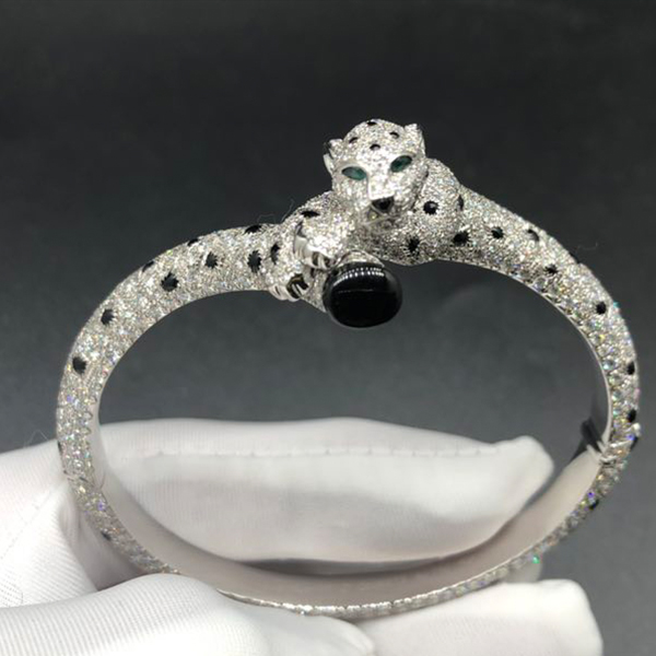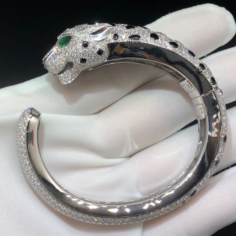 This amazing Cartier Full Pave Diamonds Onyx Panthere de Cartier Double Panther Platinum Bracelet was designed with two contronting panthers. The Cartier panthere bracelet has pavé-set brilliant-cut diamonds, highlighted with cabochon onyx spots and nose and pear-shaped emerald eyes and is mounted in platinum and 18 karat white gold. Metal: Platinum and 18k white gold (Weight is about 138g in size 17) Diamonds: 1670 brilliant-cut diamonds totaling 20.57ct(Size 17) Gemstones: Onyx & 4 emeralds eyes Price: Please contact Lexga to get the factory direct wholesale price Whatsapp: +1 262 806 8175 Looking for 100% exactly same quality as authentic Custom Made […]