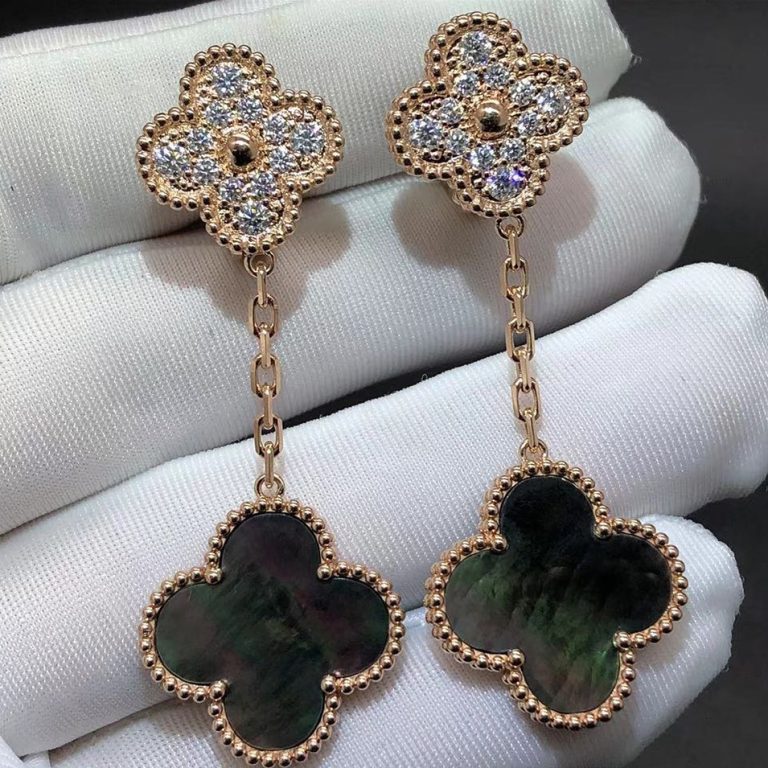 These elegant Van Cleef & Arpels Vintage Alhambra diamond earrings are crafted in 18k rose gold and adorned with sparkling pavé-set diamonds. Featuring the iconic four-leaf clover motif with delicate beaded edges, they radiate timeless charm and refined brilliance. Perfect for everyday sophistication or special occasions, these earrings embody classic French craftsmanship and enduring beauty. Collection: VCA Vintage Alhambra Earrings Metal: 18k rose gold (Weight arrpox 9.5g) Diamonds: 24 diamonds 0.96ct Motif Size: 15mm x 15mm REFERENCE: VCARP2R500 Clasp: Clip back with detachable stem in 18K rose gold, option to remove or reposition the stem LEXGA jewelry a professional jewelry […]