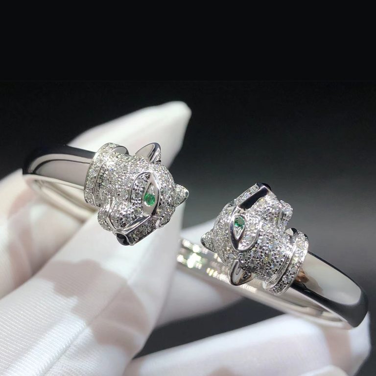 A lovely Cartier Panthere de Cartier 18K White Gold Diamonds Two Heads Bracelet from the Panthère de Cartier collection. The Panthere cuff bracelet comprises of two panther head motifs pave set 194 brilliant-cut diamonds totaling 1.37 carats opposite each other set with emerald eyes and an onyx nose. Metal: 18k white gold (Weight is about 24.5g in size 17) Diamonds: 194 brilliant-cut diamonds 1.37ct Gemstones: emeralds, onyx Band Width: 6.5 mm, Thickness: 3.8 mm Panther Head Width: 8.13 to 8.67 mm (total width 13mm) Ref. N6706217 Please contact Lexga to get the factory direct wholesale price Whatsapp: +1 262 806 […]