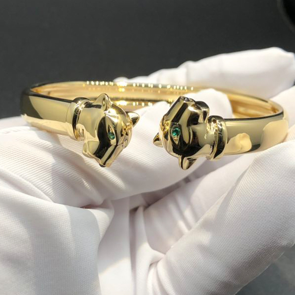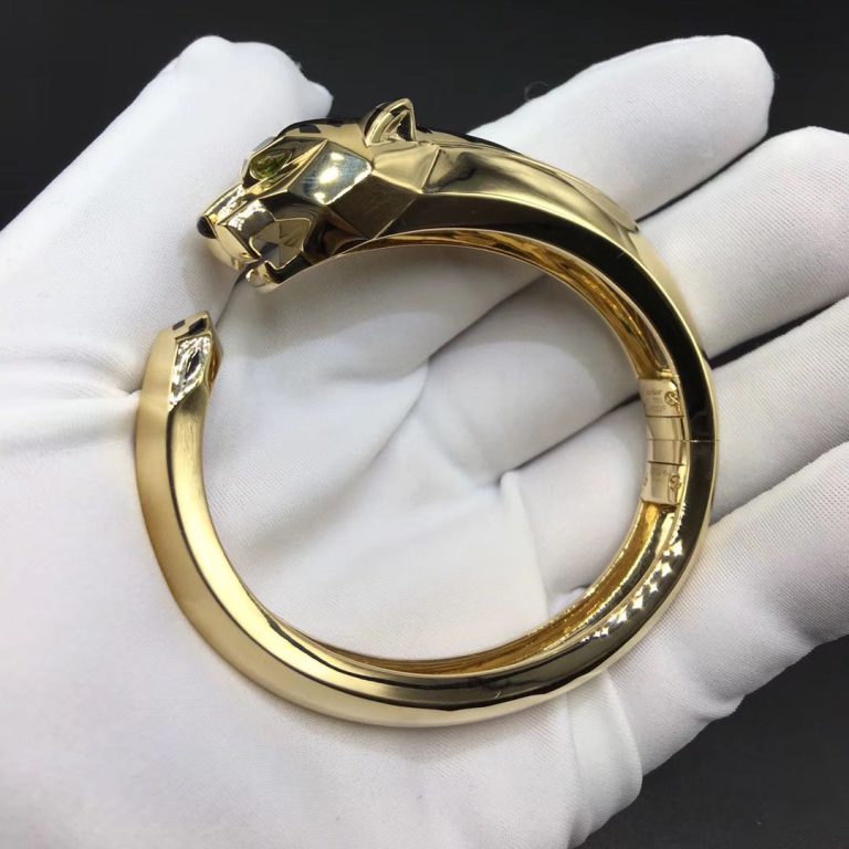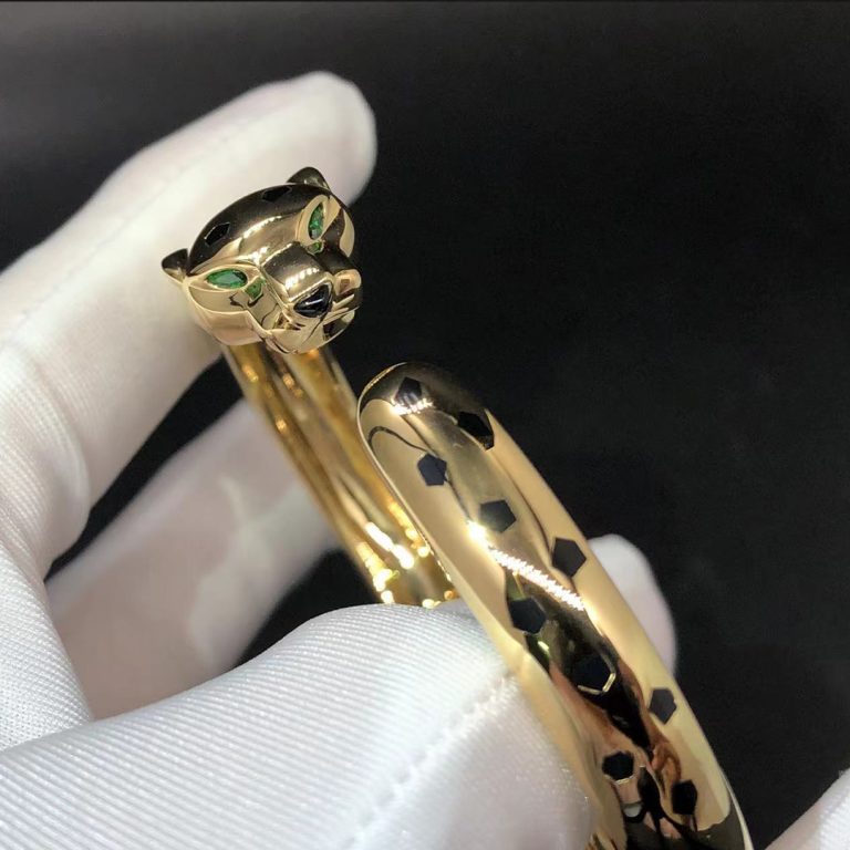 An 18k yellow gold tsavorite, onyx and black lacquer Cartier Panthere de Cartier solid 18k Yellow Gold Bracelet. The Panther bracelet features the iconic panther head motif set with 2 tsavorite eyes, onyx nose complimented by black lacquer detailing. Metal: 18k Yellow gold (Weight is about 48.5g in size 17) Gemstones: onyx, black lacquer, set with 2 tsavorite garnets Band Width: 8.33 mm (Panther Head Width: 12.4 mm) Thickness: 4.7 mm Ref. N6721917 Please contact Lexga to get the factory direct wholesale price Whatsapp: +1 262 806 8175 Looking for 100% exactly same quality as authentic Custom Made Cartier Bracelet in diamond […]