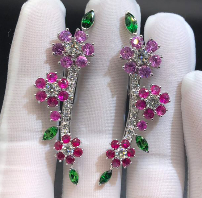 Evoking the romance of a wildflower meadow, these exceptional Van Cleef & Arpels Folie des Prés High Jewelry Multi-Gems earrings showcase the Maison’s poetic interpretation of nature. Crafted in 18k white gold, the fluid, openwork design is embellished with sparkling diamonds, softly hued pink and mauve sapphires arranged as blossoming flowers, and vivid tsavorite garnets for a fresh burst of green. Graceful and luminous, these earrings embody movement, color harmony, and the refined elegance of Van Cleef & Arpels high jewelry. Collection: VCA Folie Des Pres Earrings Metal: 18k white gold (Weight approx 21.3g) Diamonds: 24 round diamonds 2.23ct Gemstones: […]