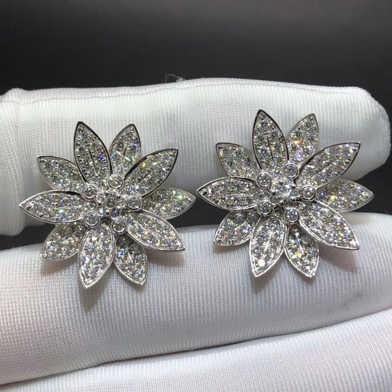 The VCA Van Cleef & Arpels Lotus Pavé Diamond Earrings, Medium Model capture the Maison’s poetic vision of nature through a radiant floral silhouette. Meticulously crafted in 18k white gold, each earring is composed of layered, marquise-shaped petals fully pavé-set with brilliant-cut diamonds, creating exceptional depth and sparkle. Diamonds of varying sizes form a luminous center, enhancing the flower’s natural movement and dimension. Elegant yet striking, these earrings reflect exquisite craftsmanship and timeless sophistication, making them a captivating statement for both refined daytime wear and glamorous evening occasions. Collection: Van Cleef & Arpels Lotus Earrings Metal: 18k white gold (Weight […]