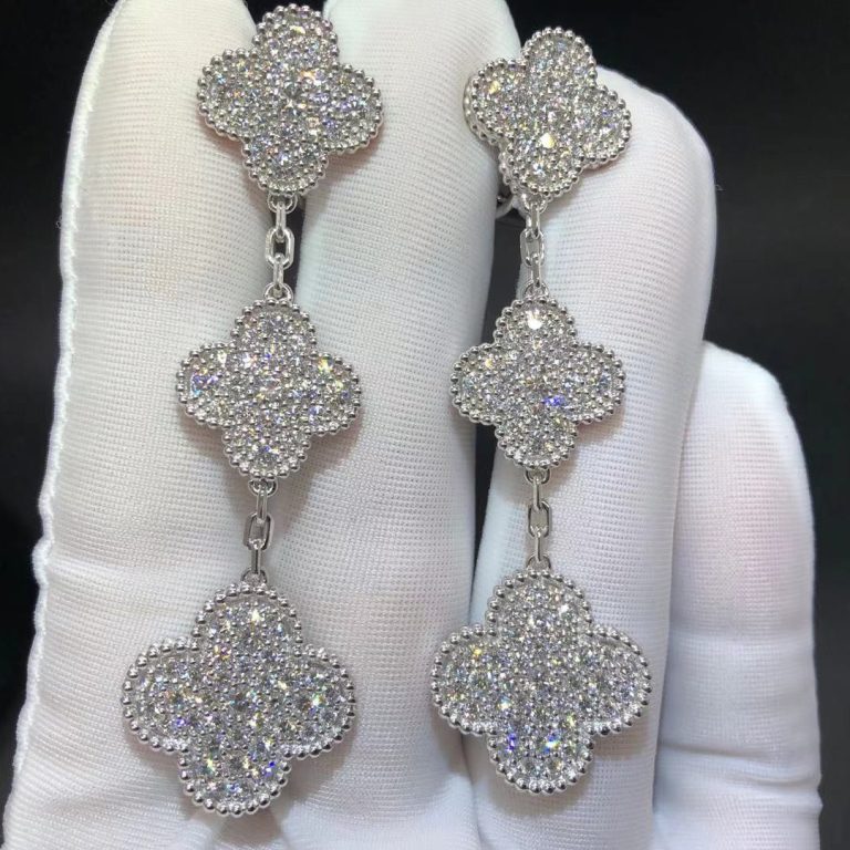 Inspired by the iconic Alhambra motif, these Van Cleef & Arpels Magic Alhambra Full Pave Diamonds 3 Motifs earrings showcase three clover motifs delicately suspended in a graceful drop design. Crafted in luminous 18k white gold, each motif is fully pavé-set with brilliant-cut diamonds, creating exceptional sparkle and movement. Elegant yet contemporary, these earrings embody Maison craftsmanship and timeless sophistication, perfect for elevating both daywear and evening ensembles. Collection: VCA Magic Alhambra Earrings Metal: 18k white gold (Weight approx 26.4 g) Diamonds: 158 diamonds 4.25ct Length: 69.00 mm Motif size: 15mm and 20mm clovers motifs REFERENCE: VCARN9MR00 Clasp: Clip back […]