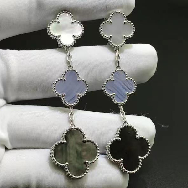 Exude elegance with these Van Cleef & Arpels Magic Alhambra Mother of Pearl and Chalcedony 3 Motif Drop Earrings. Crafted from 18k white gold, this exquisite pair showcases three motifs featuring a harmonious blend of mother of pearl and Chalcedony. The delicate and iconic clover-shaped designs are intricately set with iconic beaded 18K white gold edges, enhancing the natural beauty of the stones. Collection: VCA Magic Alhambra 3 Motifs Earrings Metal: 18k white gold (Weight approx 19.2g) Gemstones:4 White and Grey Mother-of-Pearl, 2 Chalcedony Earring total length: 6.80 cm Motif size: 15mm and 20mm clovers motifs REFERENCE: VCARN18800 Clasp: Clip […]