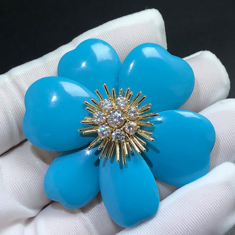 Experience the fusion of timeless traditions and modern motifs in this breathtaking Van Cleef & Arpels Rose de Noel Turquoise Flower Large Model Brooch with Round Diamonds. A symbol of eternal elegance, this floral masterpiece is an homage to the Maison’s dedication to impeccable artistry and refined beauty. Crafted in the warmth of 18K yellow gold, its delicate petals bloom in luminous white coral, a rare and cherished material that evokes a sense of purity and sophistication. At the heart of this enchanting bloom, seven brilliant round diamonds radiate with a celestial glow, adding a touch of dazzling fire to […]
