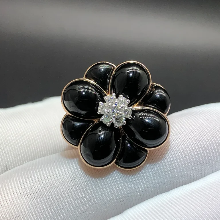 This exquisite Van Cleef & Arpels Floral Onyx & Diamonds 18k Rose Gold Flower Ring features radiant, polished onyx petals beautifully contrasted by a brilliant cluster of sparkling diamonds at its heart. Set in warm 18k rose gold, the piece gains a soft, romantic glow that enhances its sculptural elegance. Artful and expressive, it celebrates the maison’s mastery in transforming nature’s poetry into a timeless statement of refined luxury. Collection: Van Cleef & Arpels floral ring Metal: 18k rose gold (Weight is 20.25g in size 7) Diamonds: 7 diamonds 0.35ct Gemstones: 8 black onyx Flower Size: 22.6mm (W) × 22.7mm […]
