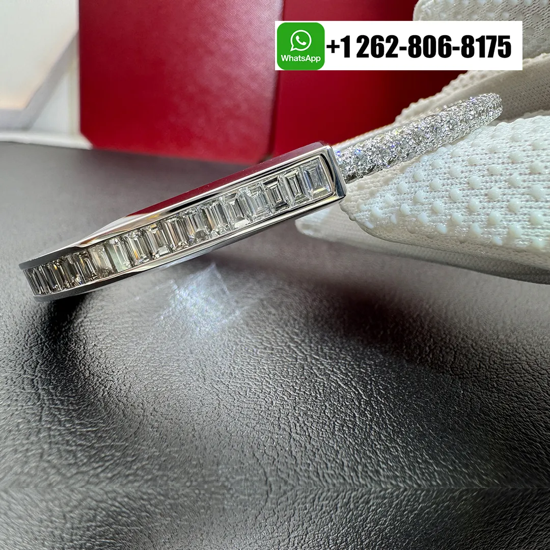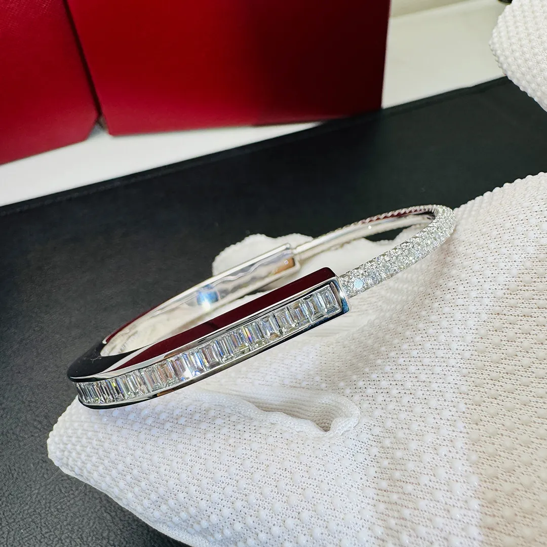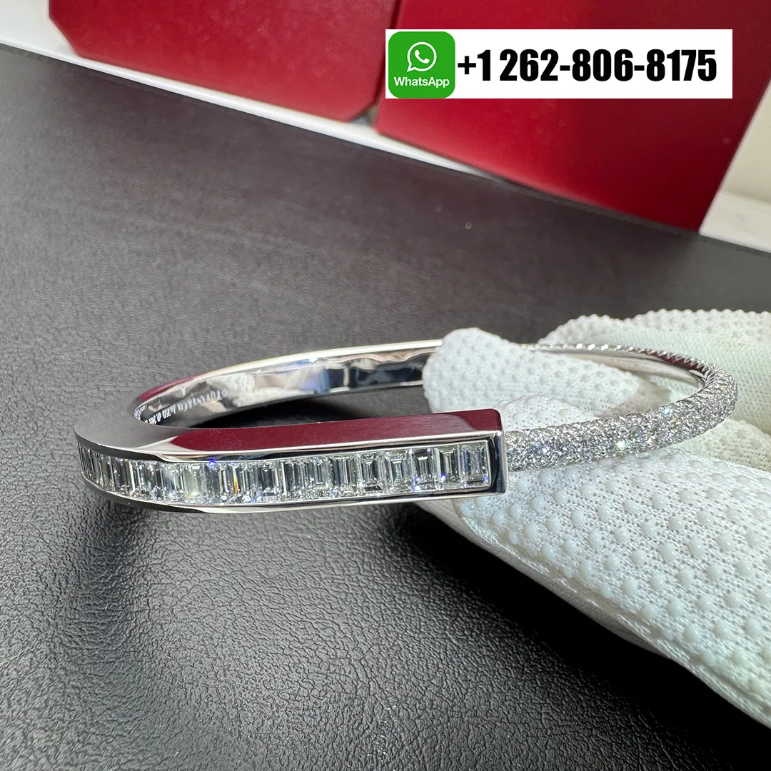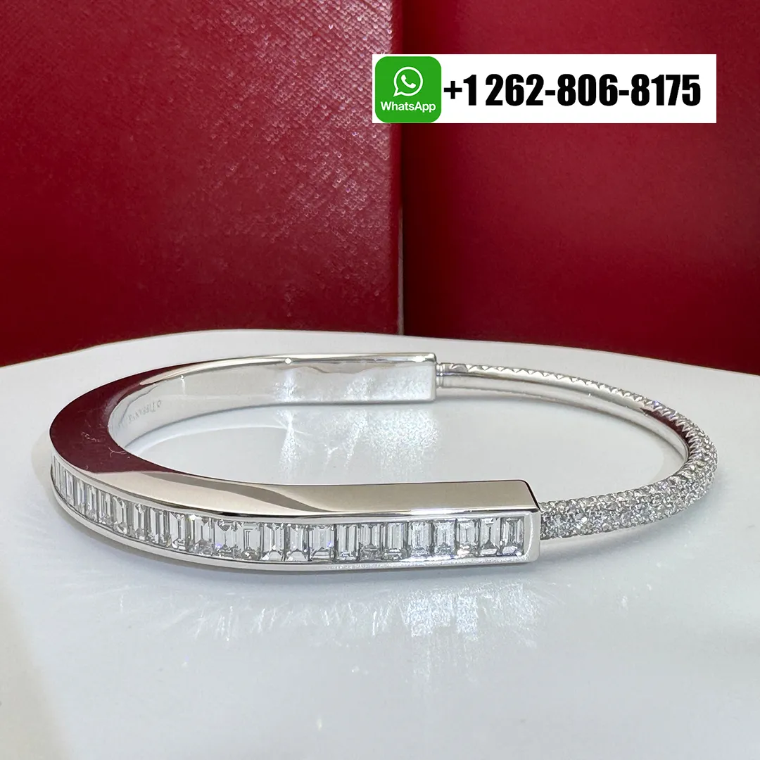 This elegant Tiffany Lock bangle with Baguette and Pavé Diamonds bracelet is crafted in luminous 18k white gold, symbolizing enduring connection and modern sophistication. The iconic lock motif is accentuated with a sleek row of baguette-cut diamonds, while pavé-set diamonds shimmer along the band. A refined yet contemporary design, perfect for effortless everyday luxury or elevated stacking.