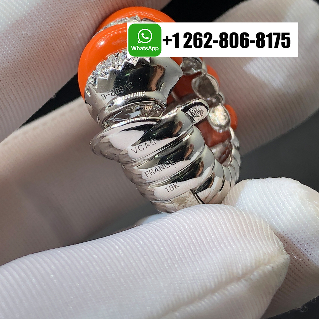 These striking Van Cleef & Arpels Coral and Diamond Hoops Ear clip Earrings are masterfully crafted in luminous 18K white gold, featuring a bold interplay of vibrant coral and sparkling diamonds. Polished coral segments alternate gracefully with diamond-set white gold links, creating a sculptural, rhythmic design. Elegant yet distinctive, the ear clips showcase the Maison’s exceptional craftsmanship and timeless sophistication, making them a captivating statement piece for both day and evening wear.